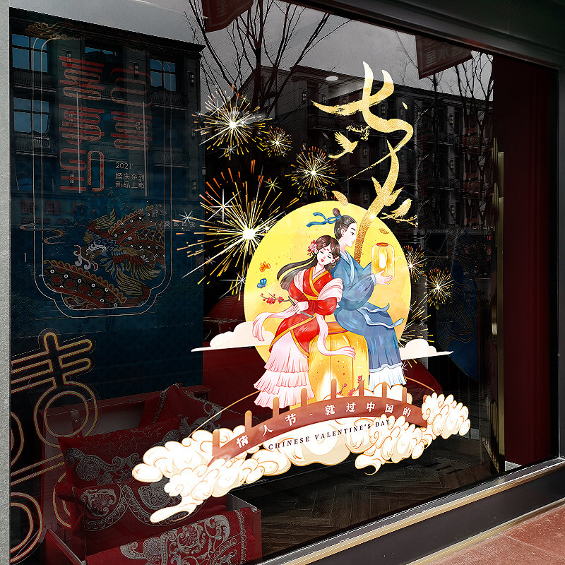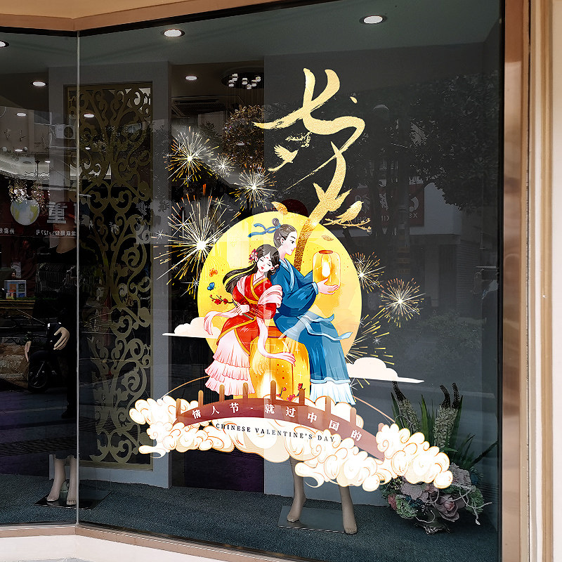 店玻璃门贴纸橱窗装 饰场景布置贴画珠宝店节 七夕a情人节服装 新品