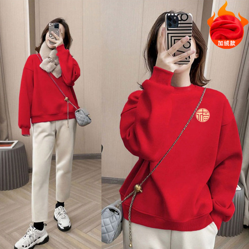 马年本命年新春红色加绒加厚卫衣女秋冬保暖纯棉上衣外套 即墨新品由