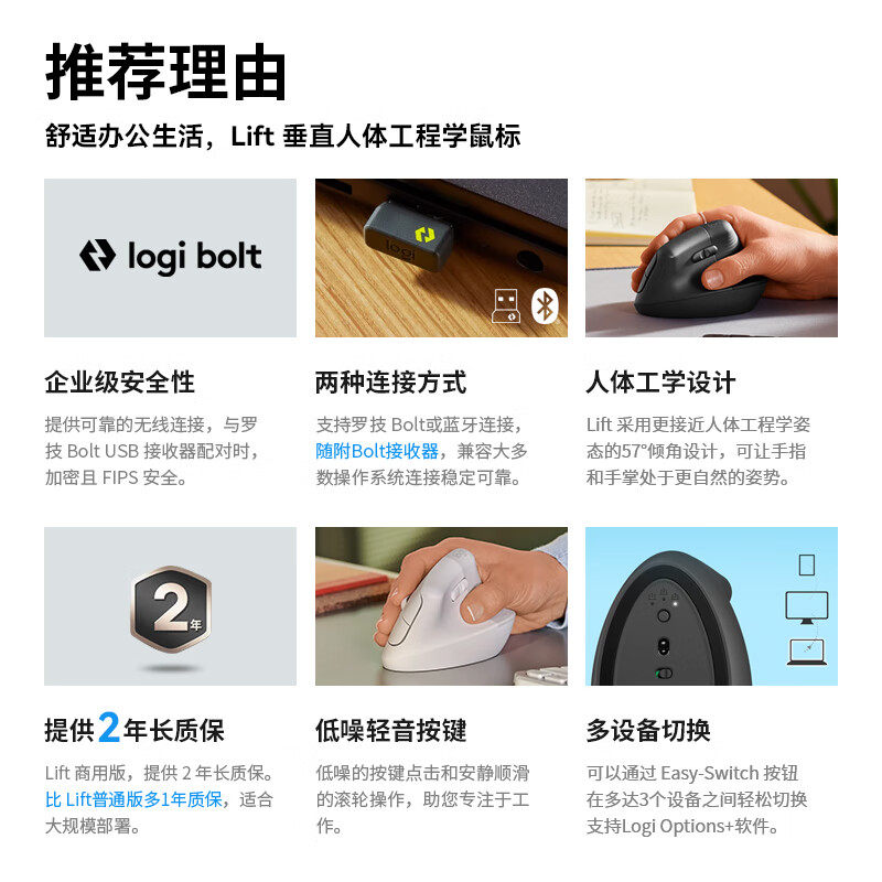 为您提供商品电脑办公静音笔记本 罗技人体工学系列LIFT蓝牙垂直无线鼠标商用版的详细介绍,