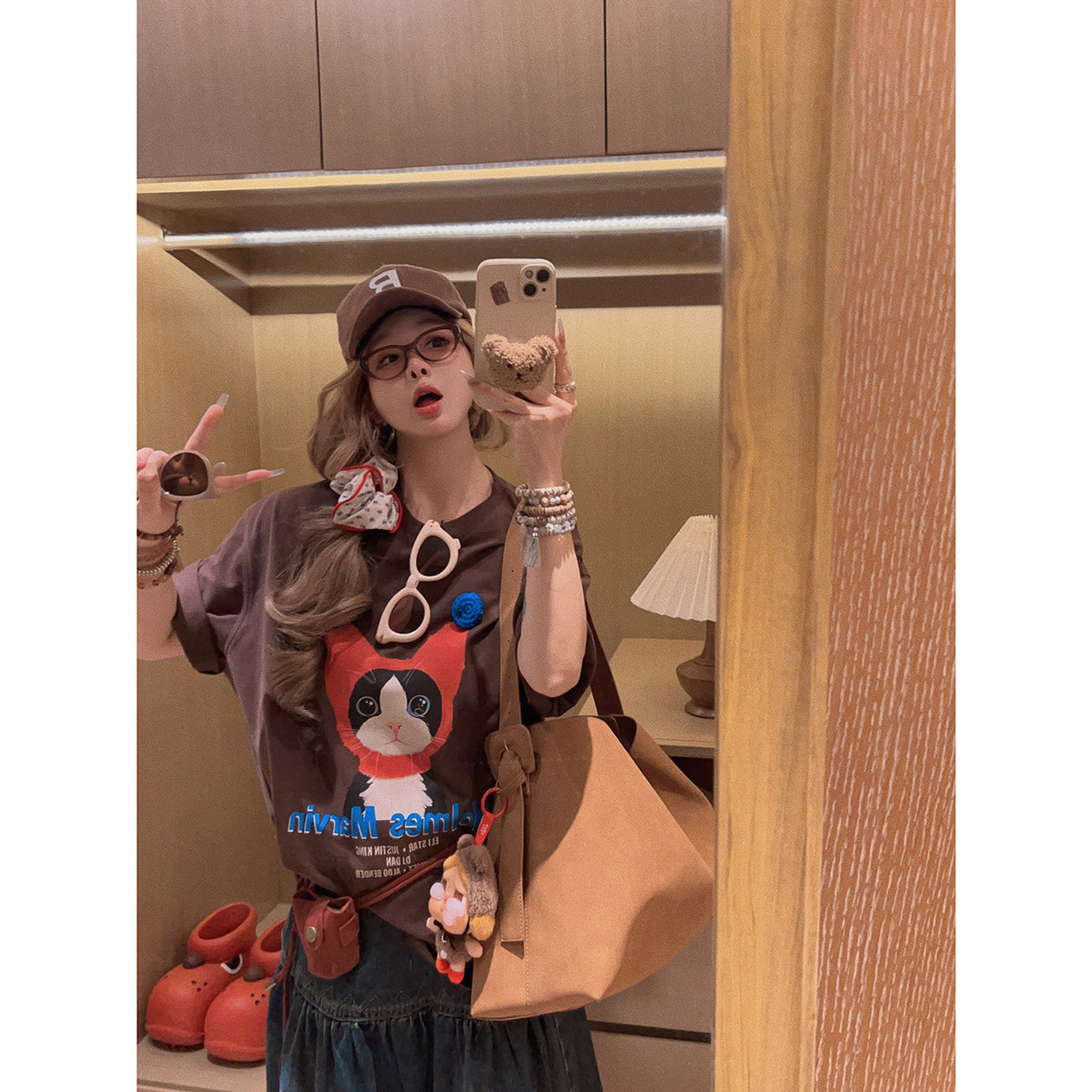 为您提供商品T恤上衣女春韩系博主风休闲宽松打底衫 猫咪印花米白色短袖 Yukiss的详细介绍,
