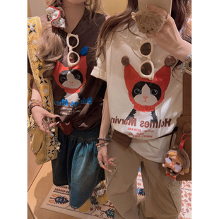 T恤上衣女春韩系博主风休闲宽松打底衫 猫咪印花米白色短袖 Yukiss由