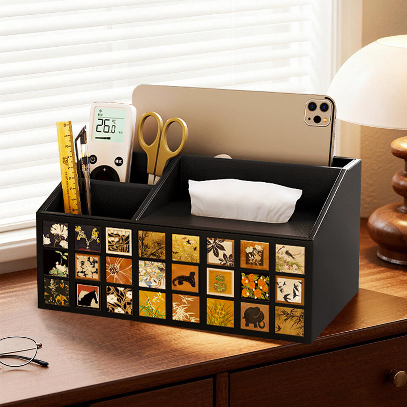 中古风多功能纸巾盒高级感皮革抽纸盒客厅茶几桌面杂物收纳盒一体