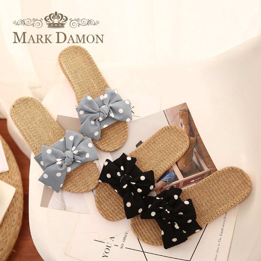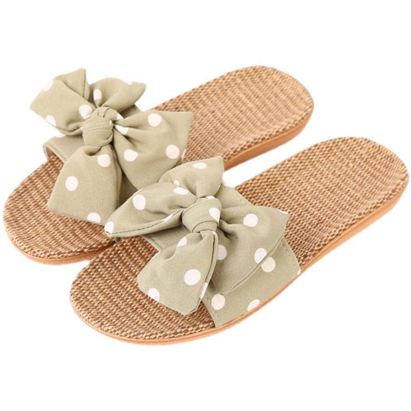 居家办公室外穿棉麻亚麻家居室内凉拖鞋 圆点蝴蝶结韩版 2025夏新款