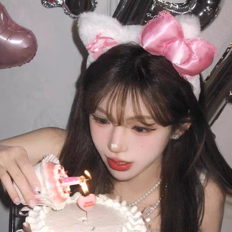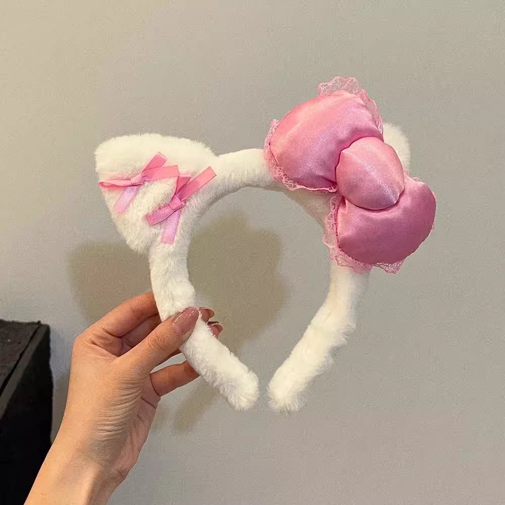 张元 粉色蝴蝶结hellokitty发箍女可爱毛绒KT猫耳朵洗脸头箍 英同款