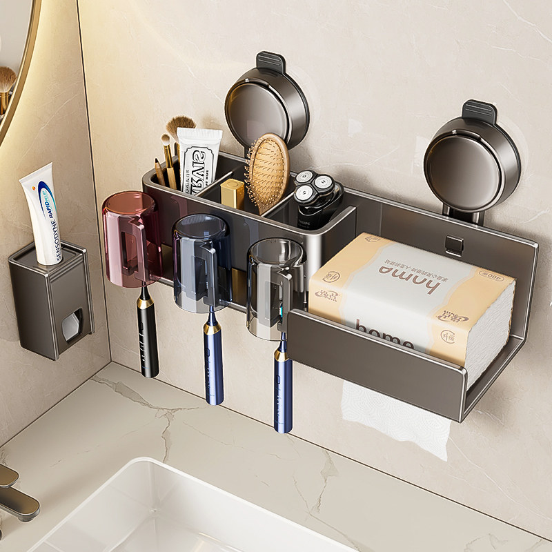 免打孔卫生间纸巾架一体牙杯漱口杯收纳挂架 吸盘牙刷置物架壁挂式