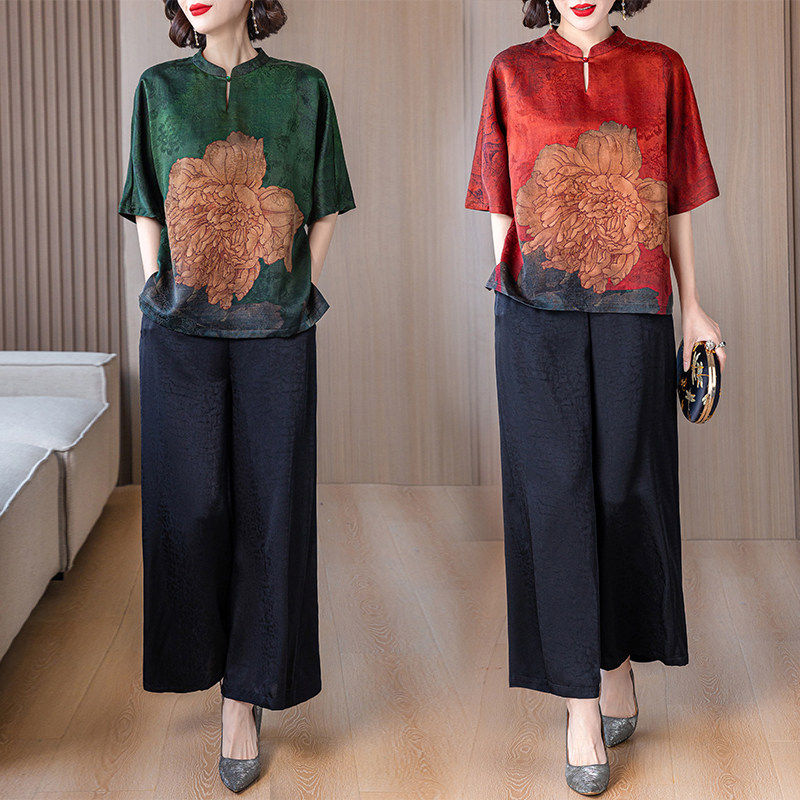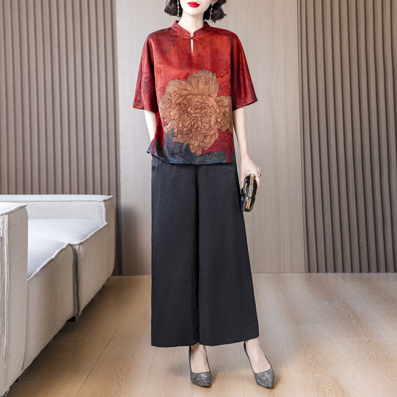 香云纱新中式 上衣阔腿裤 中老年真丝桑蚕丝妈妈套装 国风两件套夏季