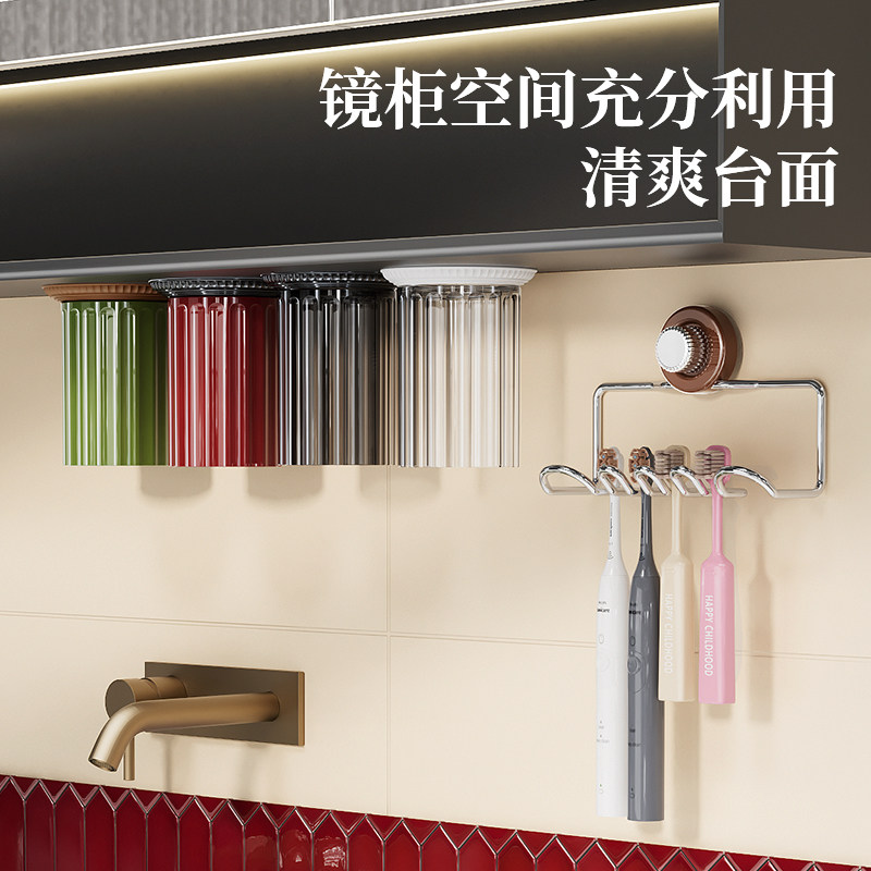 免打孔一家四口镜柜磁吸漱口杯电动牙刷架子 吸盘牙刷置物架壁挂式