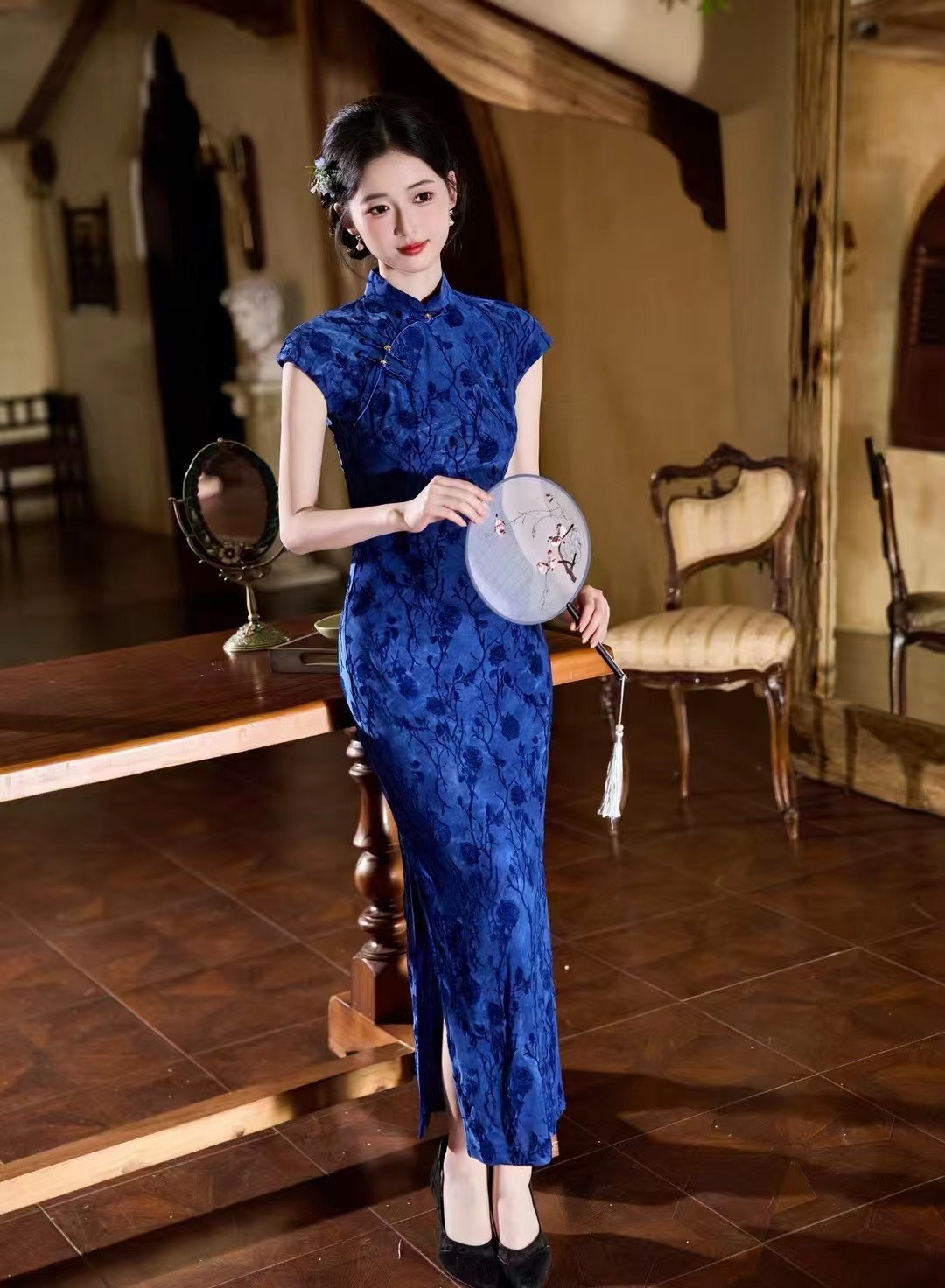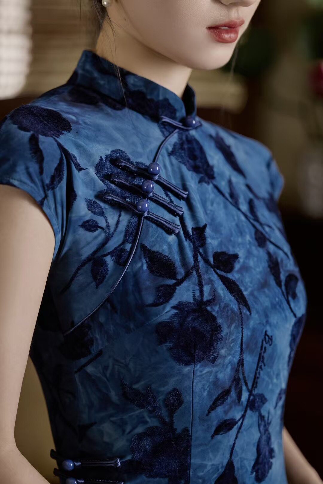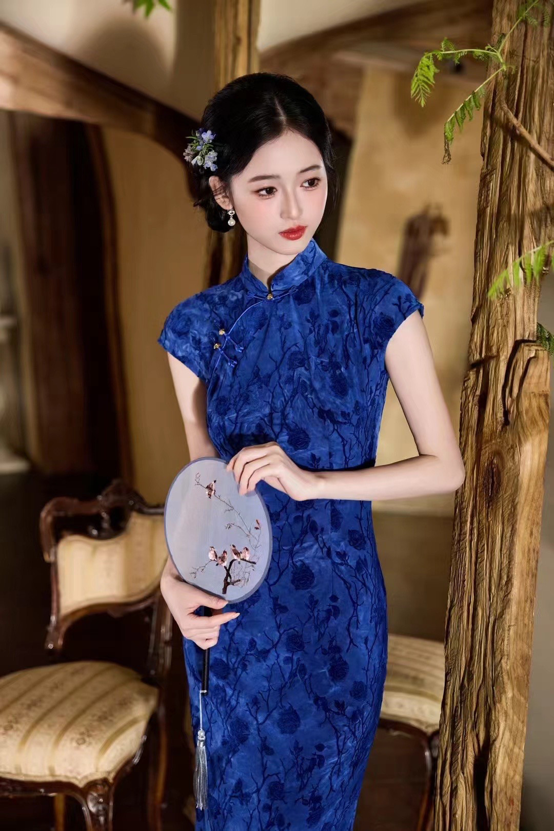 为您提供商品蓝色旗袍女民国老上海传统植绒高端优雅大气日常走秀演出服 新中式的详细介绍,