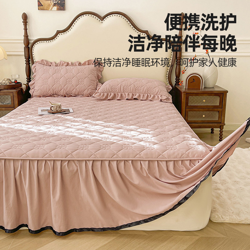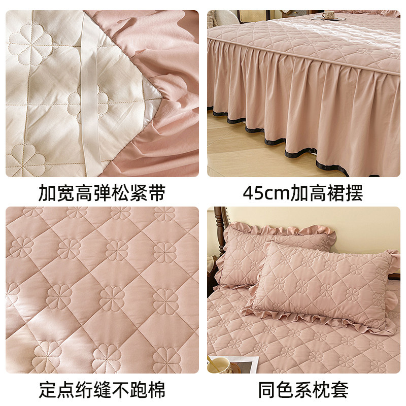 通用加厚防滑纯水洗棉三件套花边床笠罩 A类夹棉床裙单件床盖四季