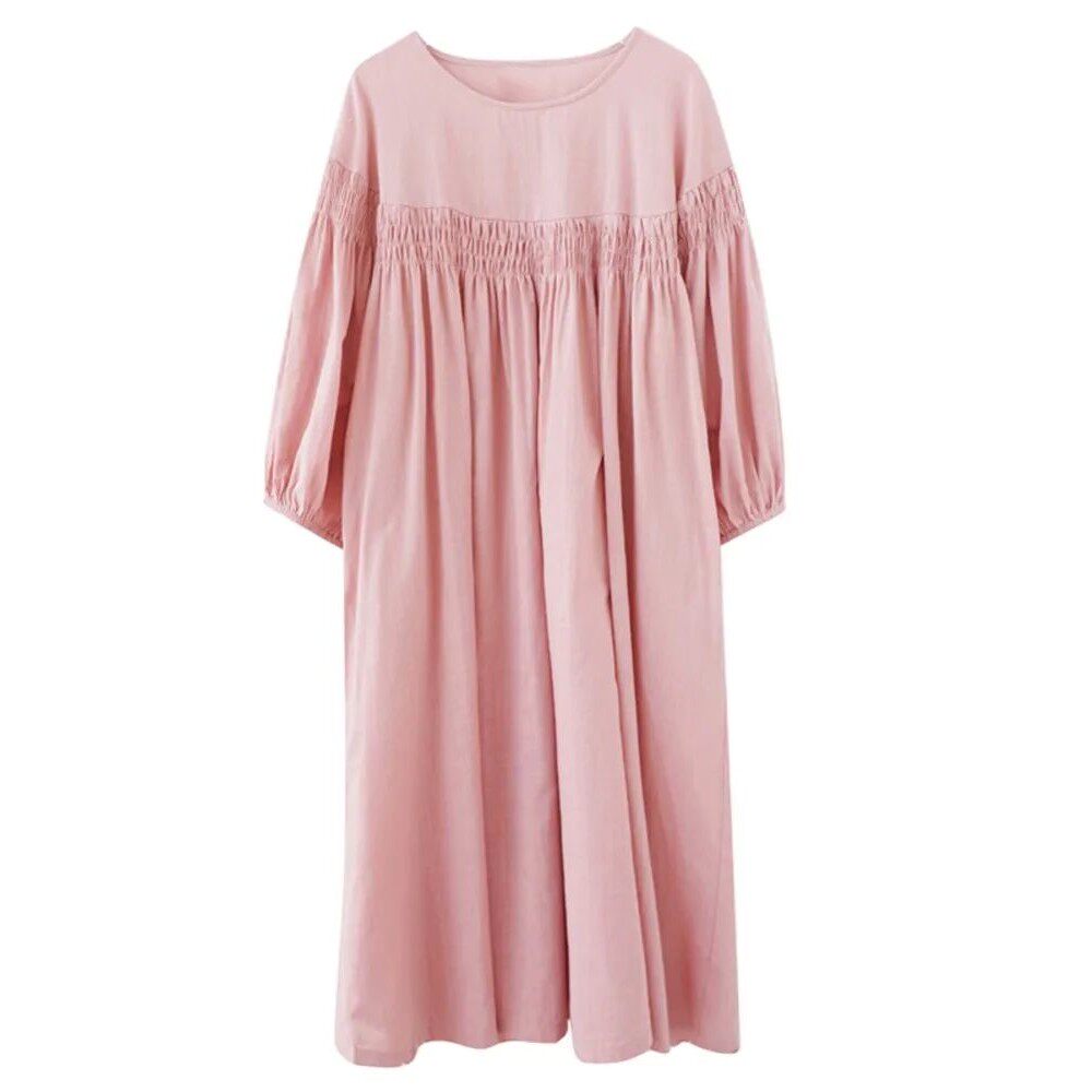 式 小众表妹 敲嫩 粉麻料中古衬衫 简约连衣裙中长款