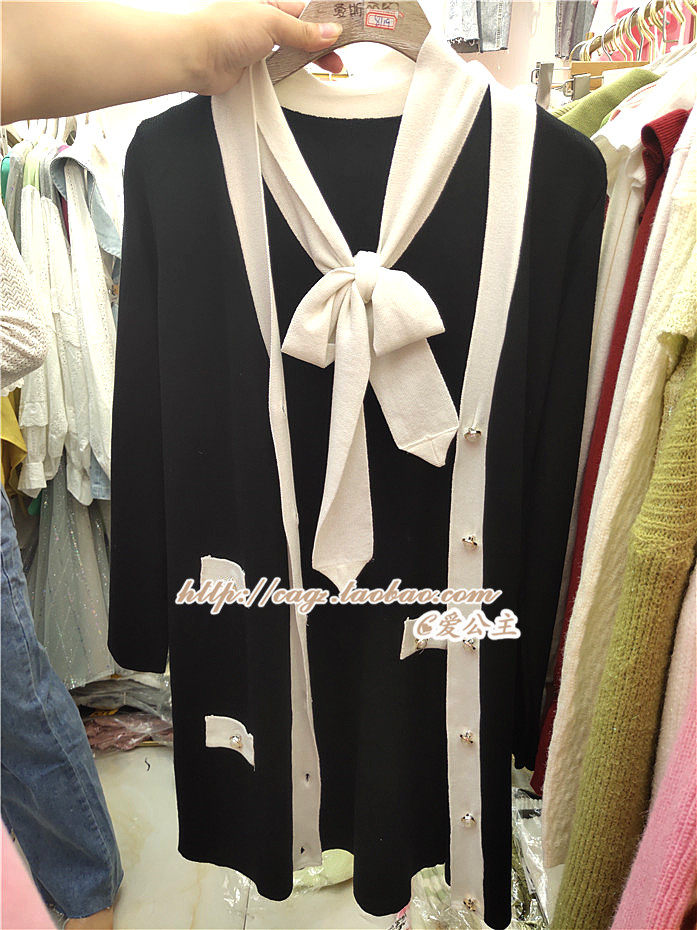 2019秋冬新款 连衣裙外套开衫 针织套装 小香风二件套蝴蝶结背心修身由