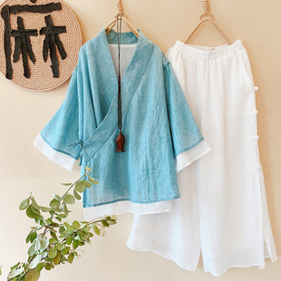 斜襟系带双层棉麻衬衫 上衣文艺复古中国风禅茶服阔腿裤 套装 女夏装