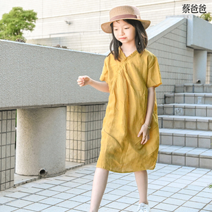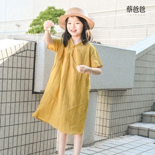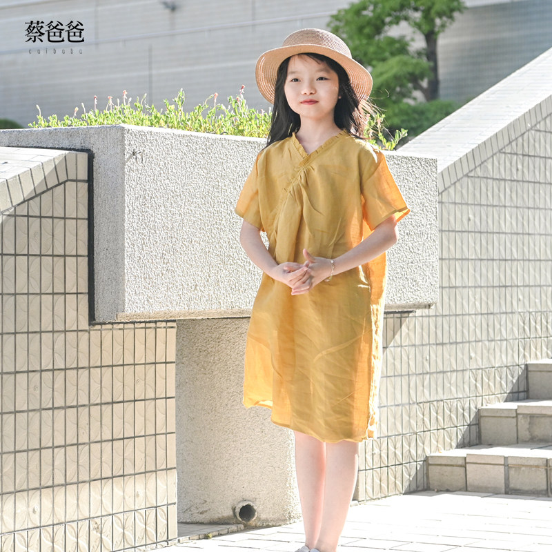 蔡爸爸原创童装 夏装 女大童装 文艺改良旗袍325 苎麻黄色连衣裙新款