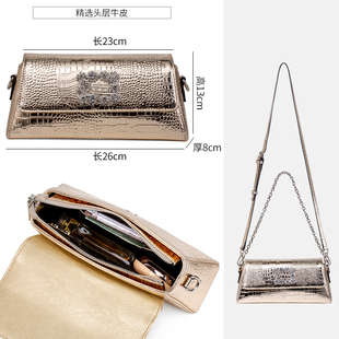 镶钻牛皮金色斜挎小包女包 高档质感鳄鱼纹真皮链条单肩腋下包时尚由
