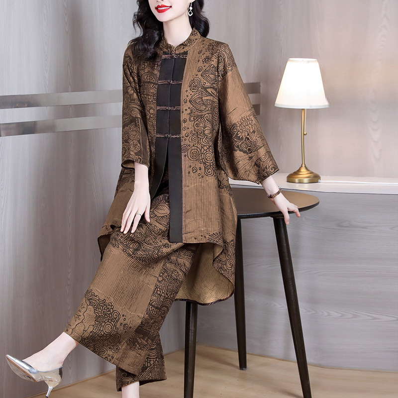 新国风印花香云纱盘扣开衫 套装 春夏新款 高端贵妇休闲两件套 阔腿裤
