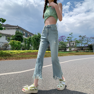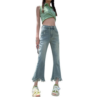 九分喇叭裤 2024春夏装 新款 超薄面料弹力八分裤 女重工艺设计 牛仔裤
