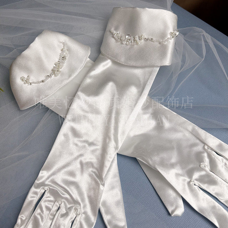 缎面手工珠子手套新娘结婚造型影楼写真配简约饰 白色婚纱中长款由