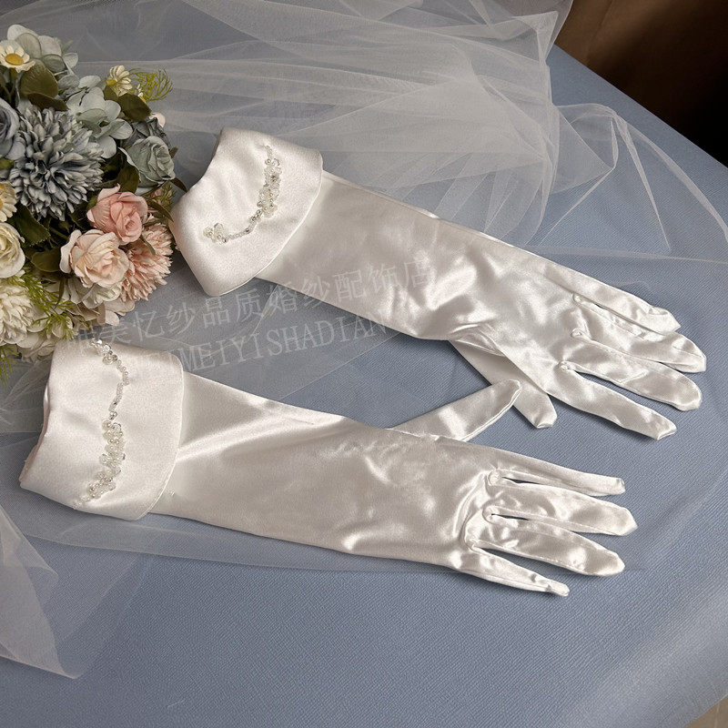 缎面手工珠子手套新娘结婚造型影楼写真配简约饰 白色婚纱中长款