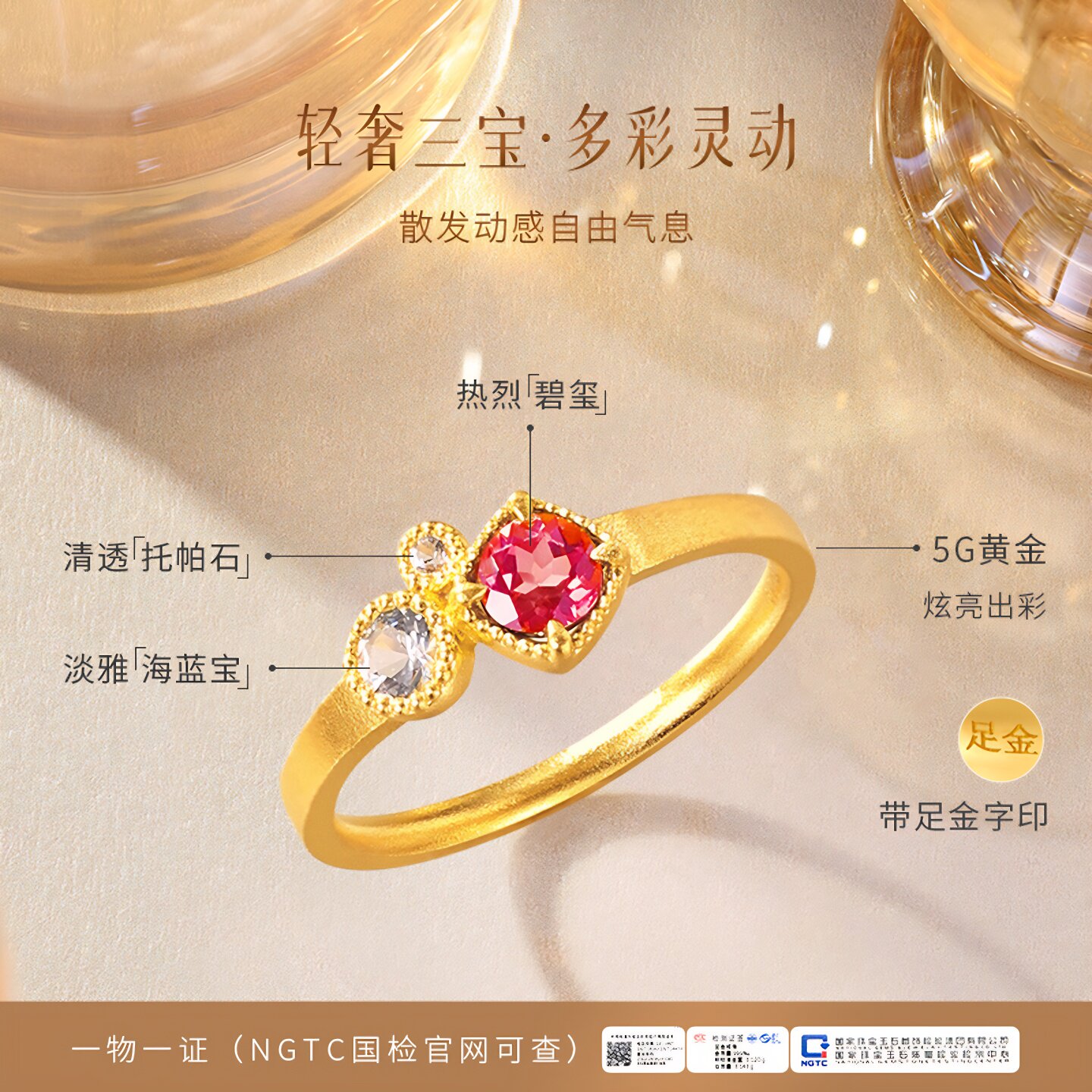 彩宝镶嵌海蓝宝足金戒指生日礼物送女朋友 金至尊碧玺黄金戒指女款由