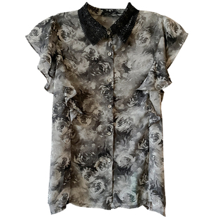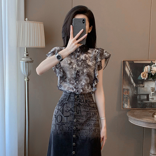 复古碎花蕾丝短袖 女夏季 新款 宽松设计感小众撞色衬衣上衣 雪纺衬衫