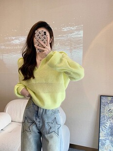 黄色上衣短款 新款 小众设计感宽松慵懒风马海毛针织衫 早 毛衣女秋装