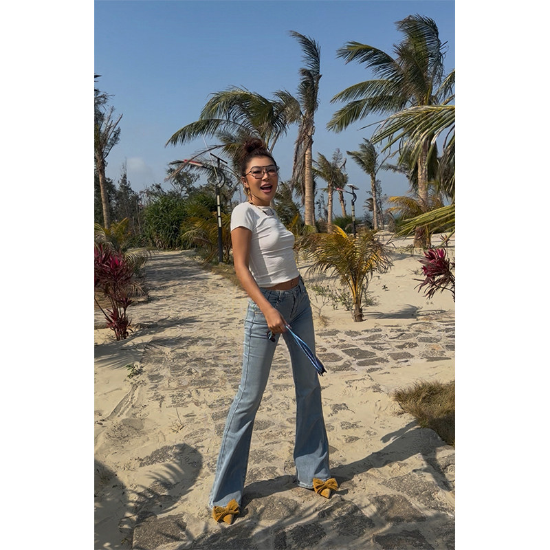 百搭简约通勤裤 子 高腰显瘦早春修身 饰微喇牛仔裤 小溪家 口袋装由