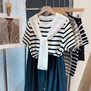为您提供商品宽松上衣短袖 毛衣女套头 女2026春夏新款 条纹圆领披肩假两件针织衫的详细介绍,