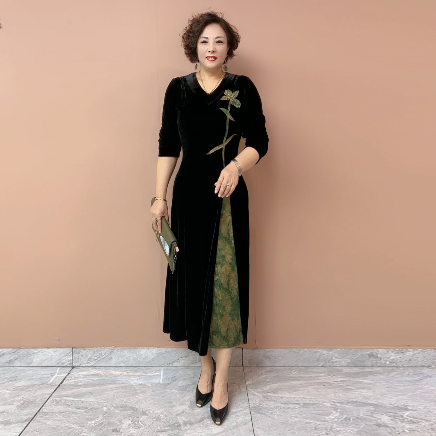 连衣裙高贵金丝绒裙子时尚 洋气中老年贵夫人长裙 国风妈妈秋装 中式
