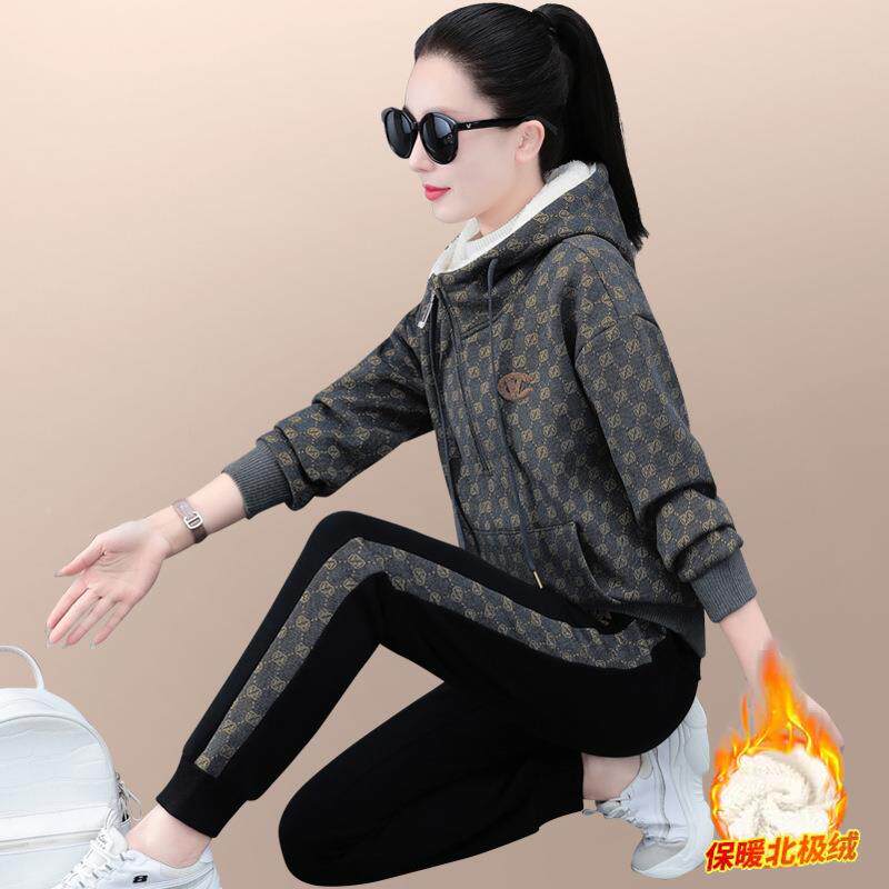 时尚 洋气花色连帽动卫衣休服两件 女冬厚闲新款 加742474绒加运套装