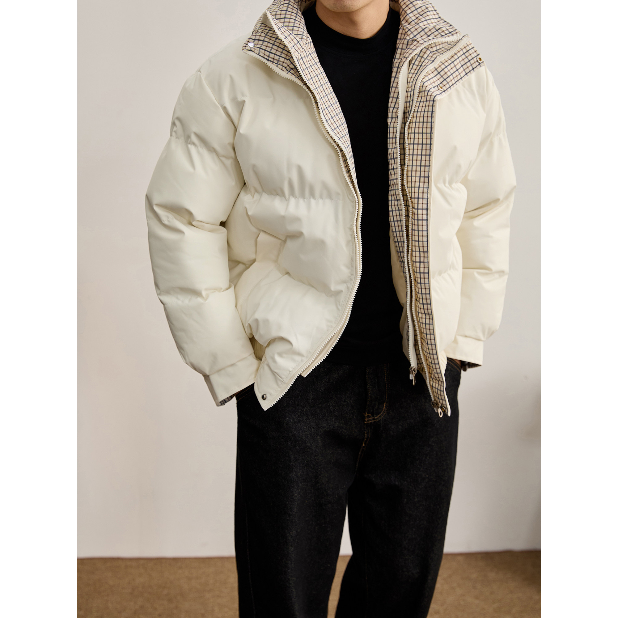 为您提供商品LUUD 内里夹棉轻盈保暖棉服男假两件格纹内衬双门襟棉衣外套 冬季的详细介绍,