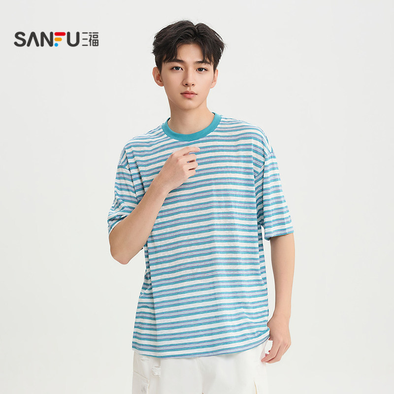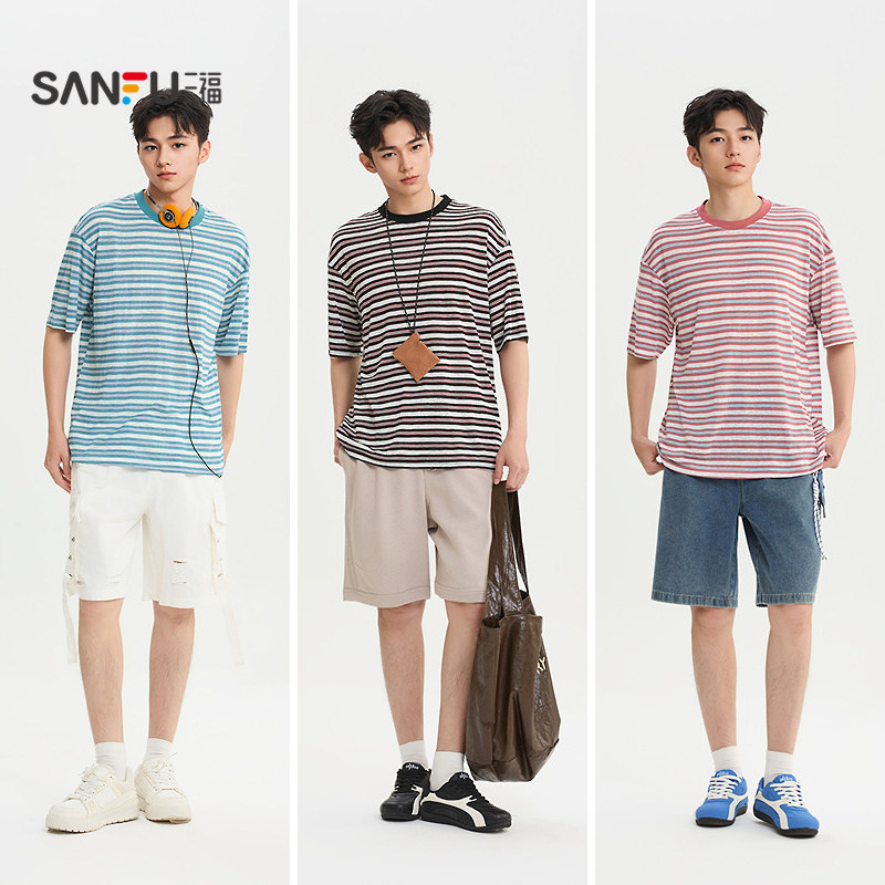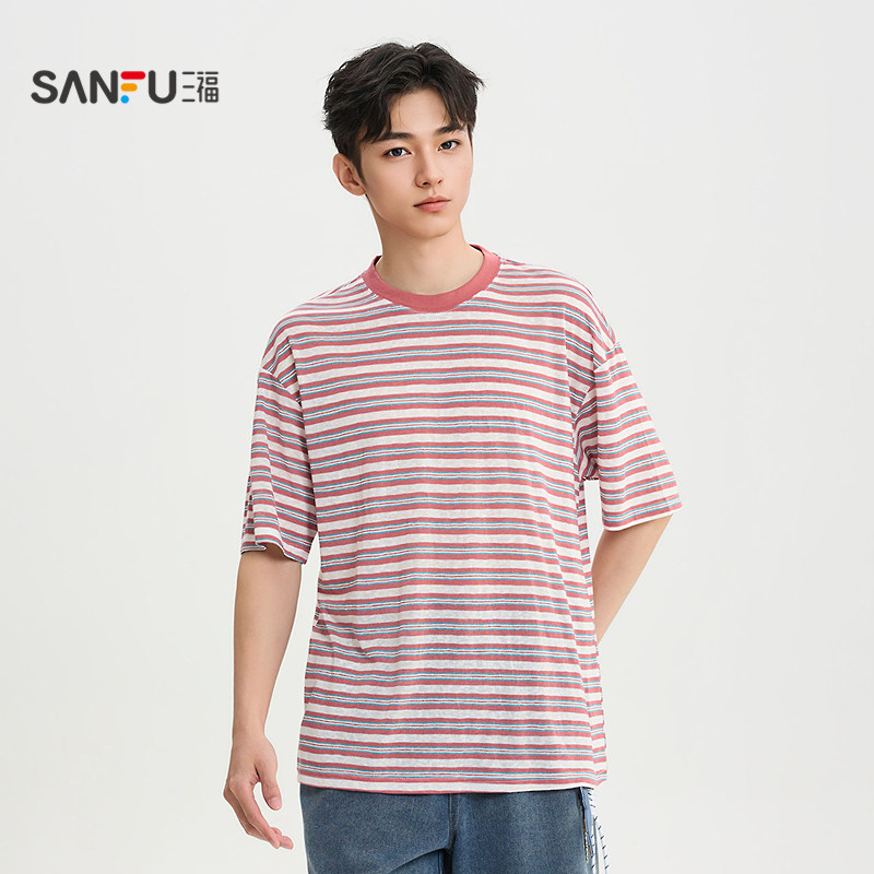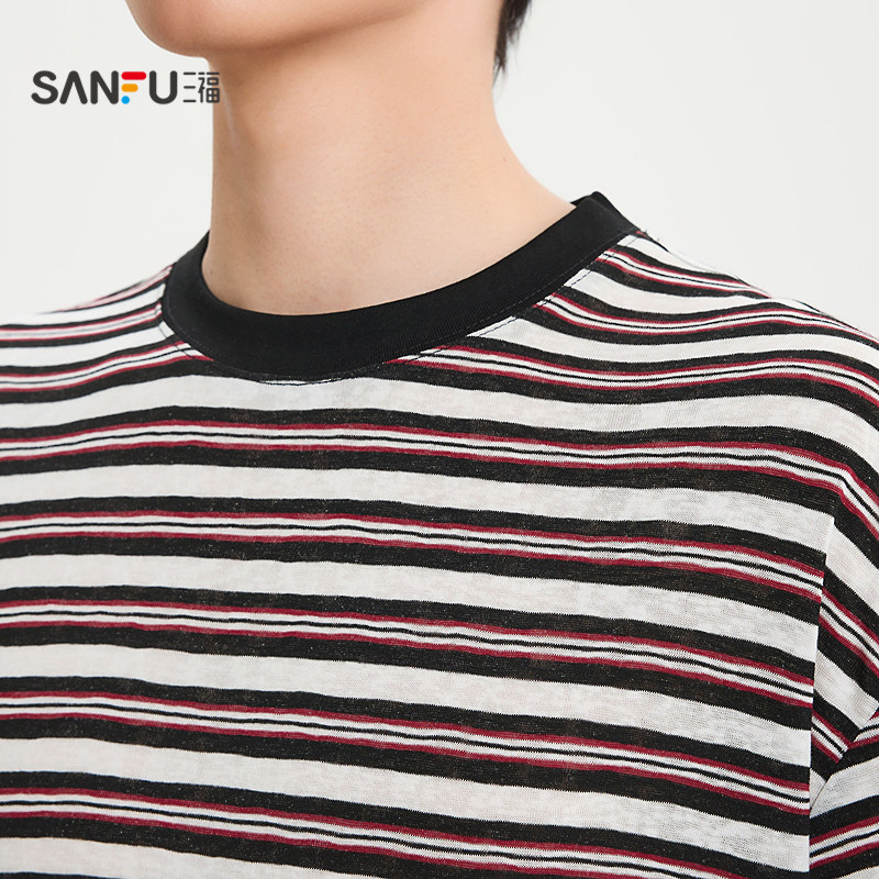 为您提供商品t恤男条纹撞色领休闲宽松圆领半袖 三福2026夏季 新款 短袖 打底衫的详细介绍,