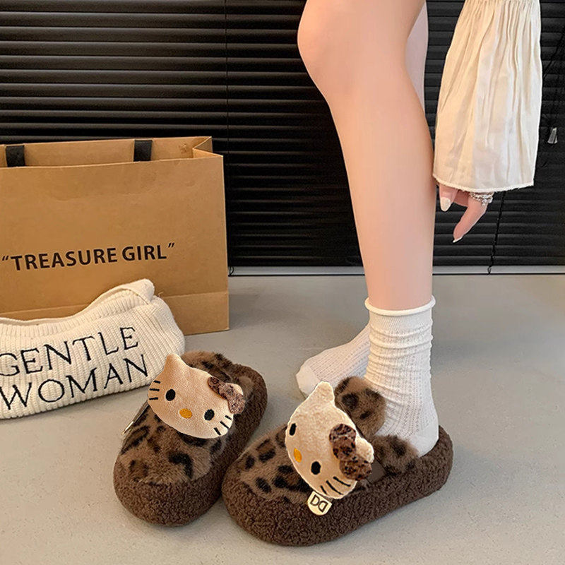 韩版 女冬外穿厚底保暖包头kitty棉拖 高级感可爱豹纹猫咪毛毛拖鞋