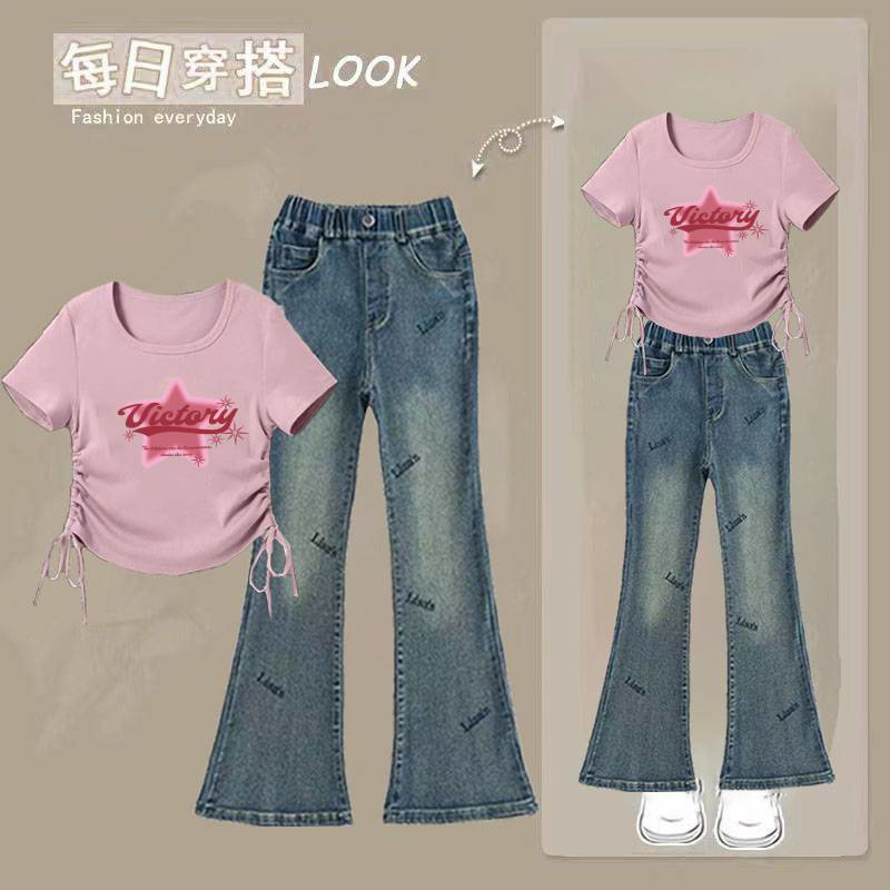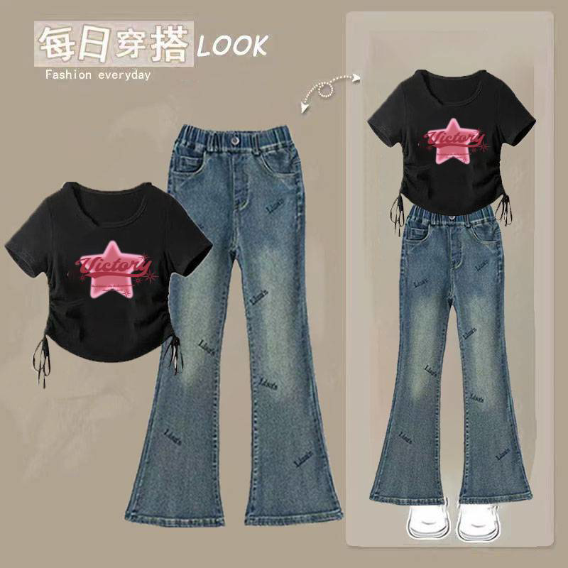 两件套中大童洋气短袖 女童夏季 套装 2026新款 五角星T恤牛仔喇叭裤