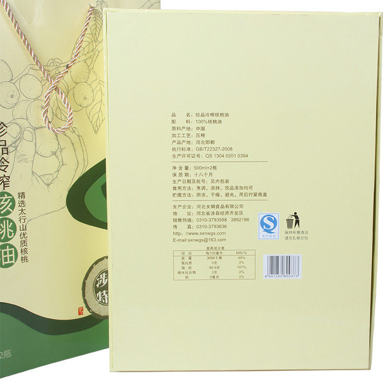为您提供商品涉县女娲核桃油凉调食用油邯郸特产冷榨核桃油500ml 2瓶礼盒装的详细介绍,
