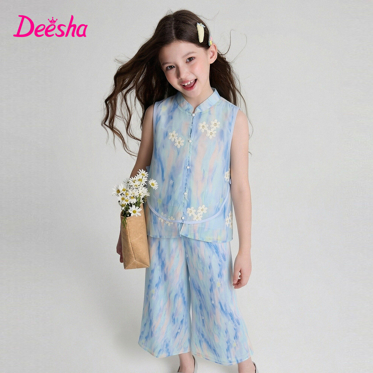 新款 笛莎官方童装 女童套装 夏季 雪纺两件套 大童女孩儿童洋气新中式