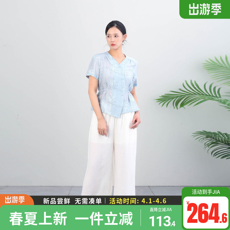 科尚新中式 套装 女2026夏新款 洋气气质两件套减龄上衣 国风V领短袖