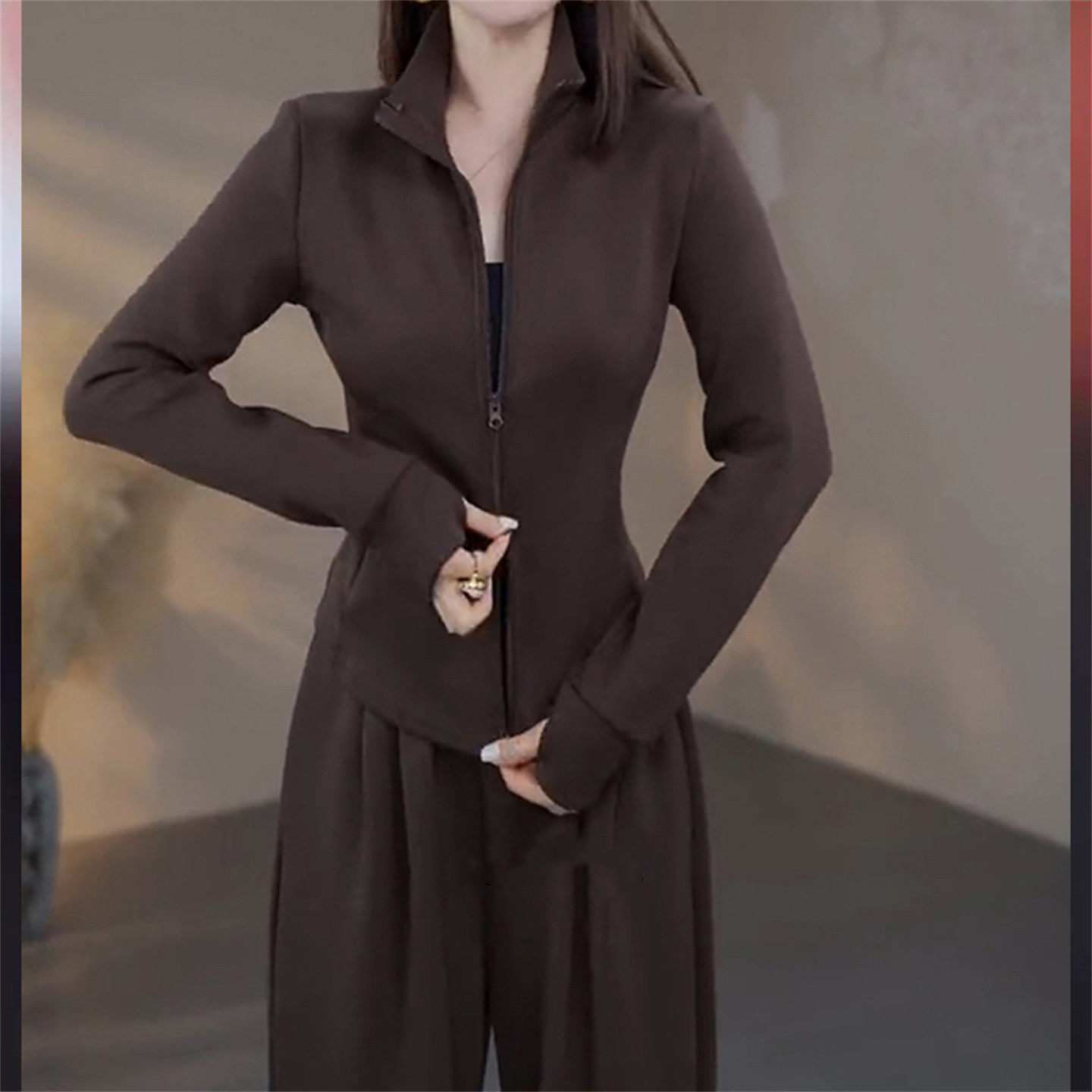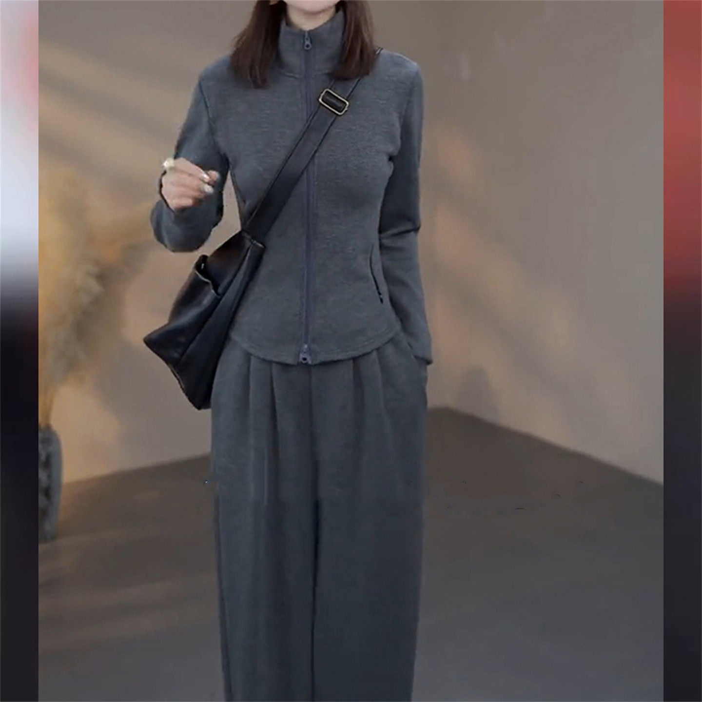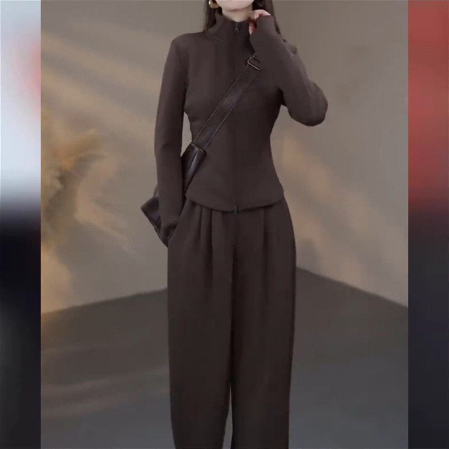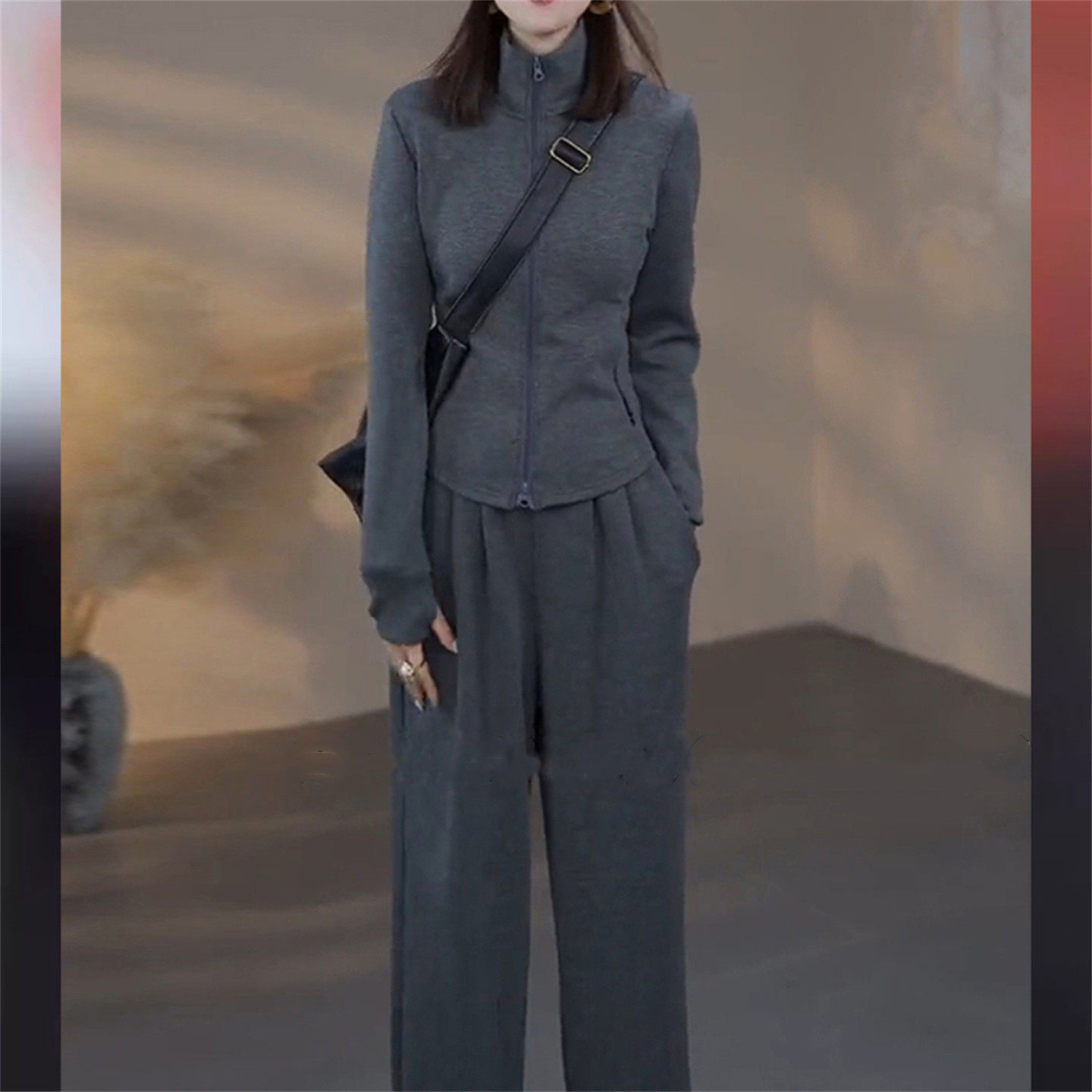 立领双拉链上衣阔腿裤 高级感时尚 两件套 修身 新款 休闲套装 女秋冬季