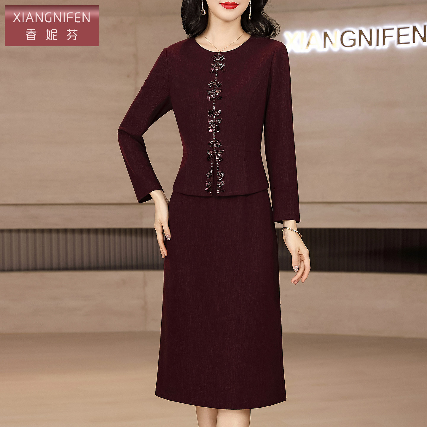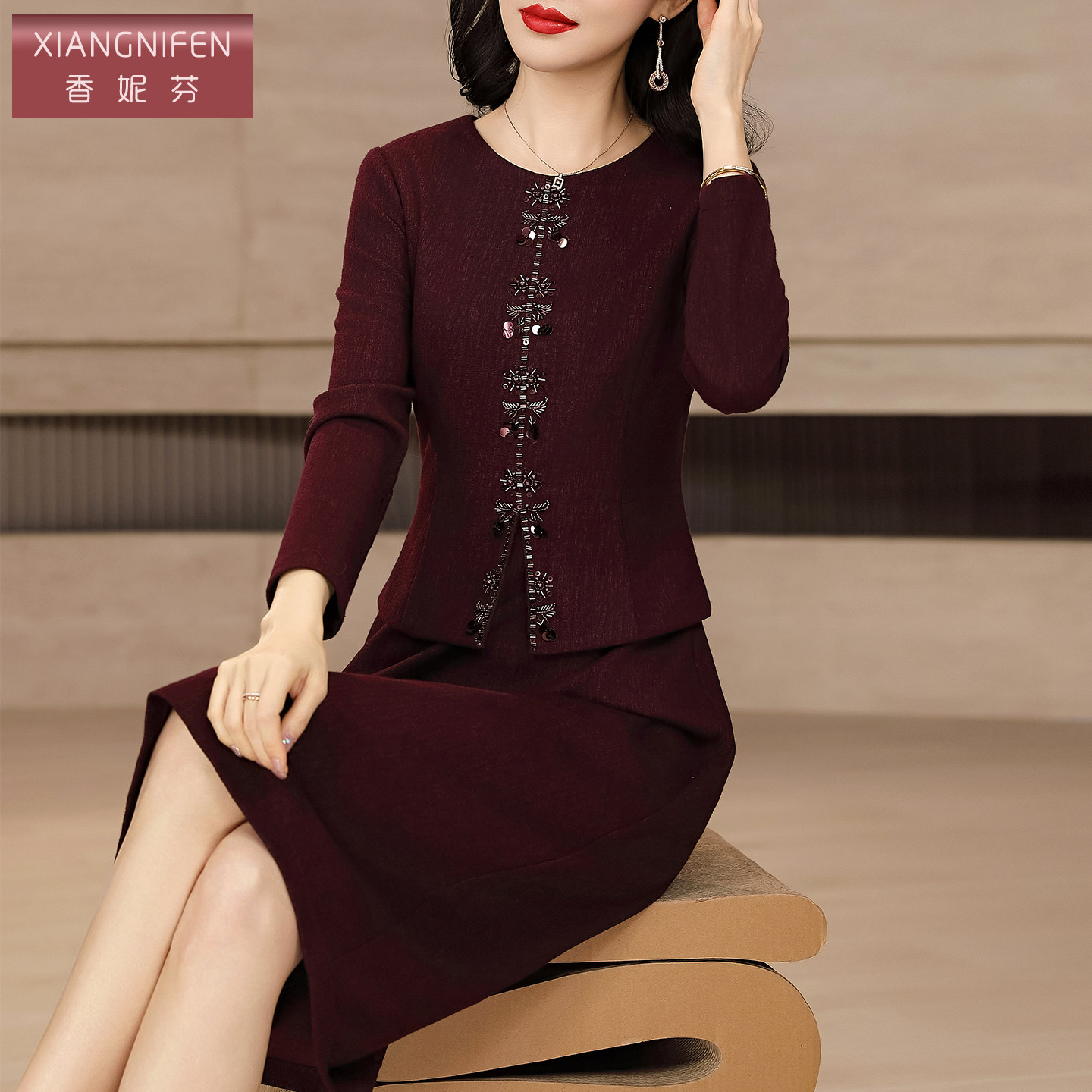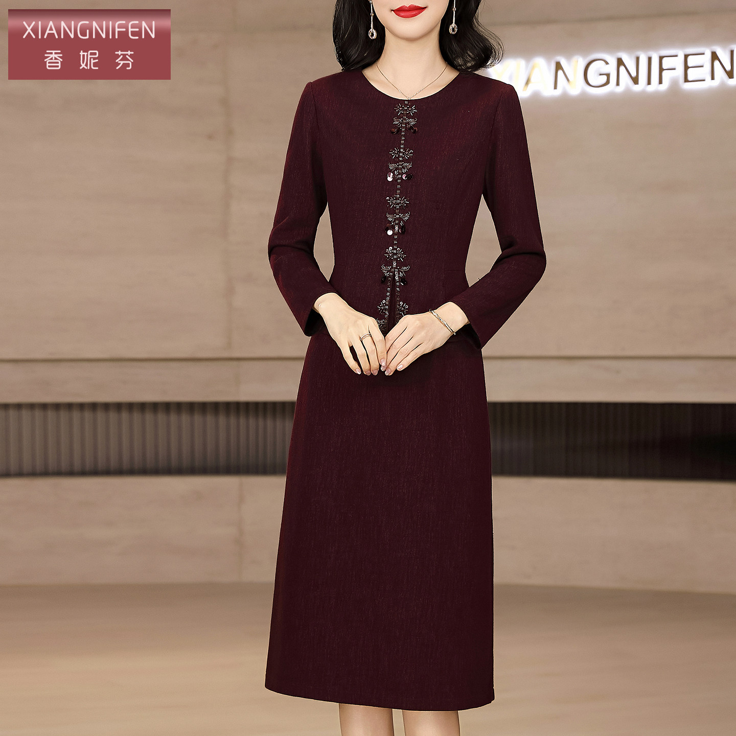 为您提供商品香妮芬设计感立体装 裙子 饰假两件年轻妈妈春秋气质连衣裙圆领长袖的详细介绍,