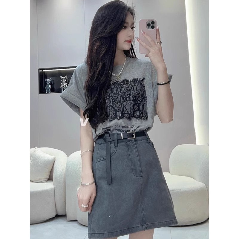 欧货时尚 女夏装 洋气上衣牛仔半身裙时尚 减龄气质高级感两件套 套装
