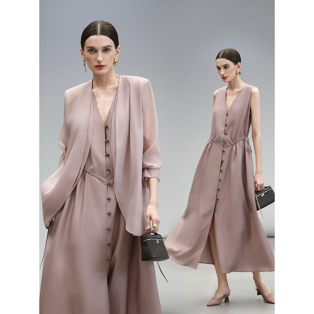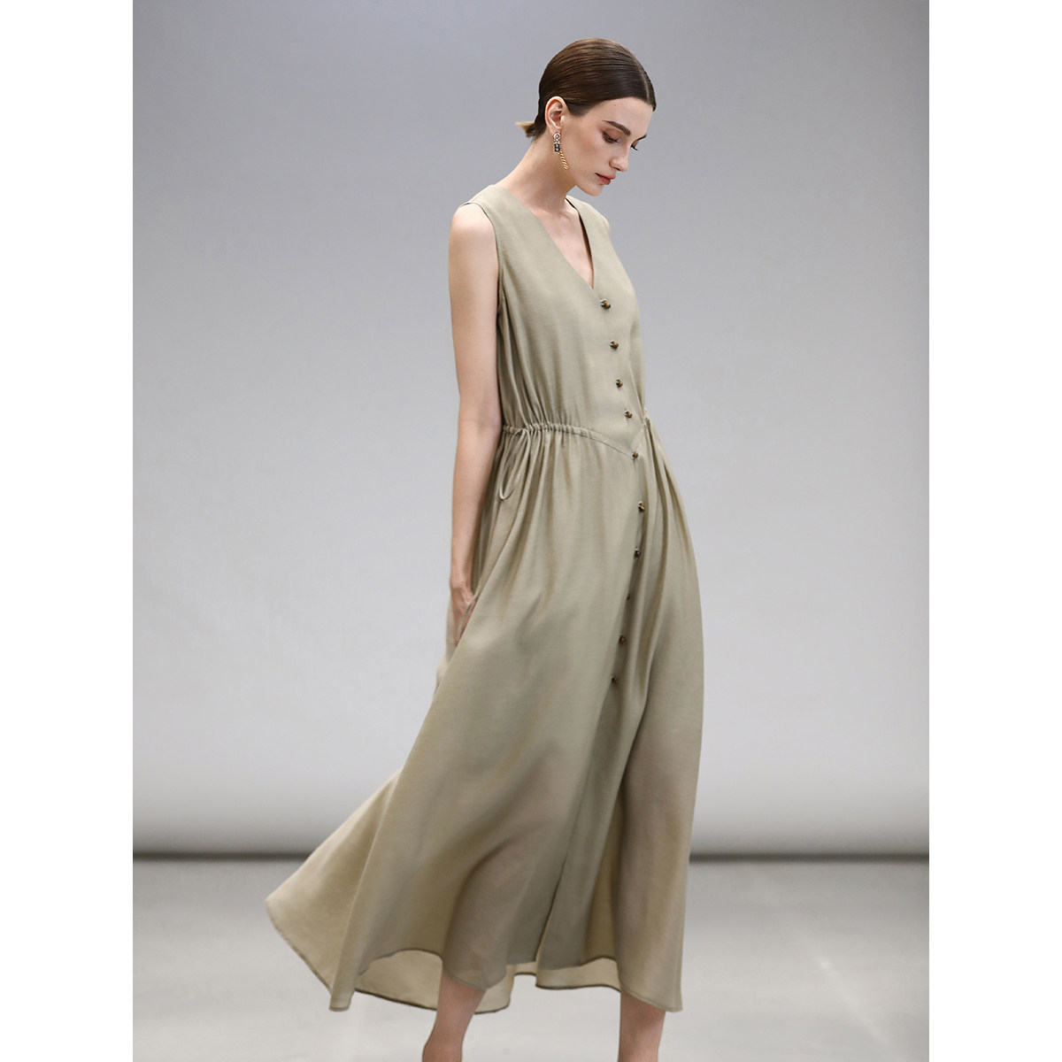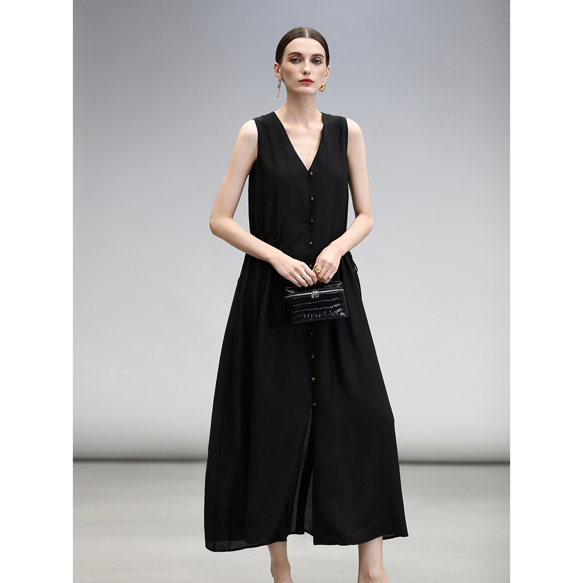 COCOBELLA静奢风V领无袖 连衣裙女夏玉石扣气质背心裙长裙FR7008由