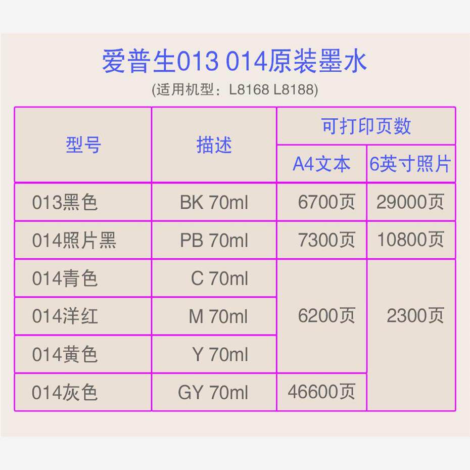 为您提供商品L8188打印机墨水013 014PB颜料黑色连供填充墨水 爱普生L8168 原装的详细介绍,