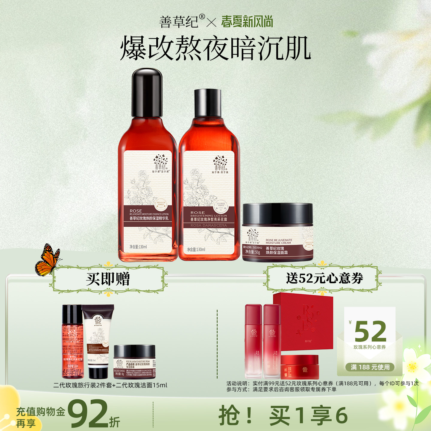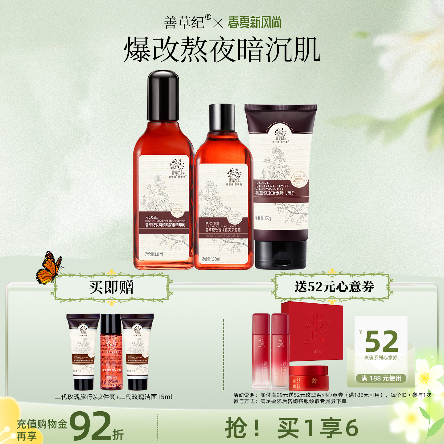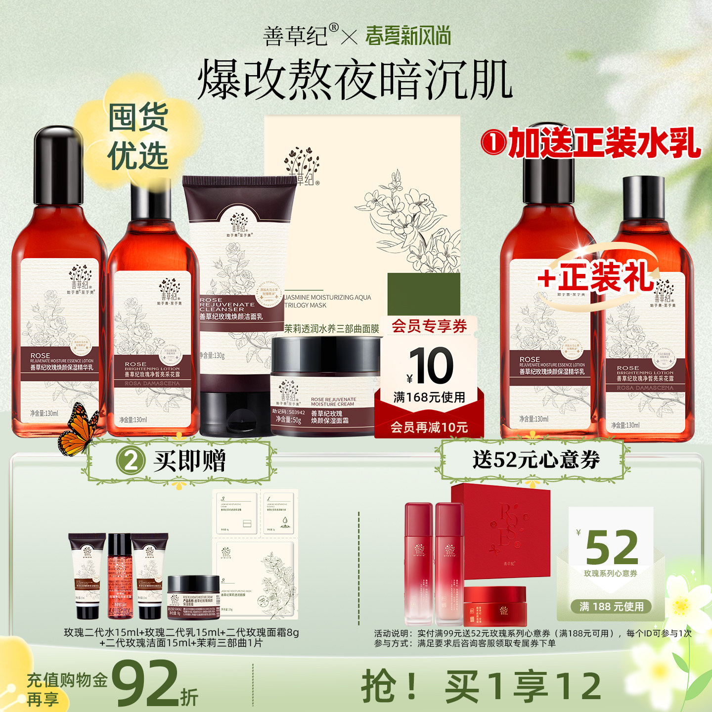 为您提供商品善草纪二代玫瑰水乳套装 送正装 水乳 提亮肤色紧致抗老 补水保湿的详细介绍,