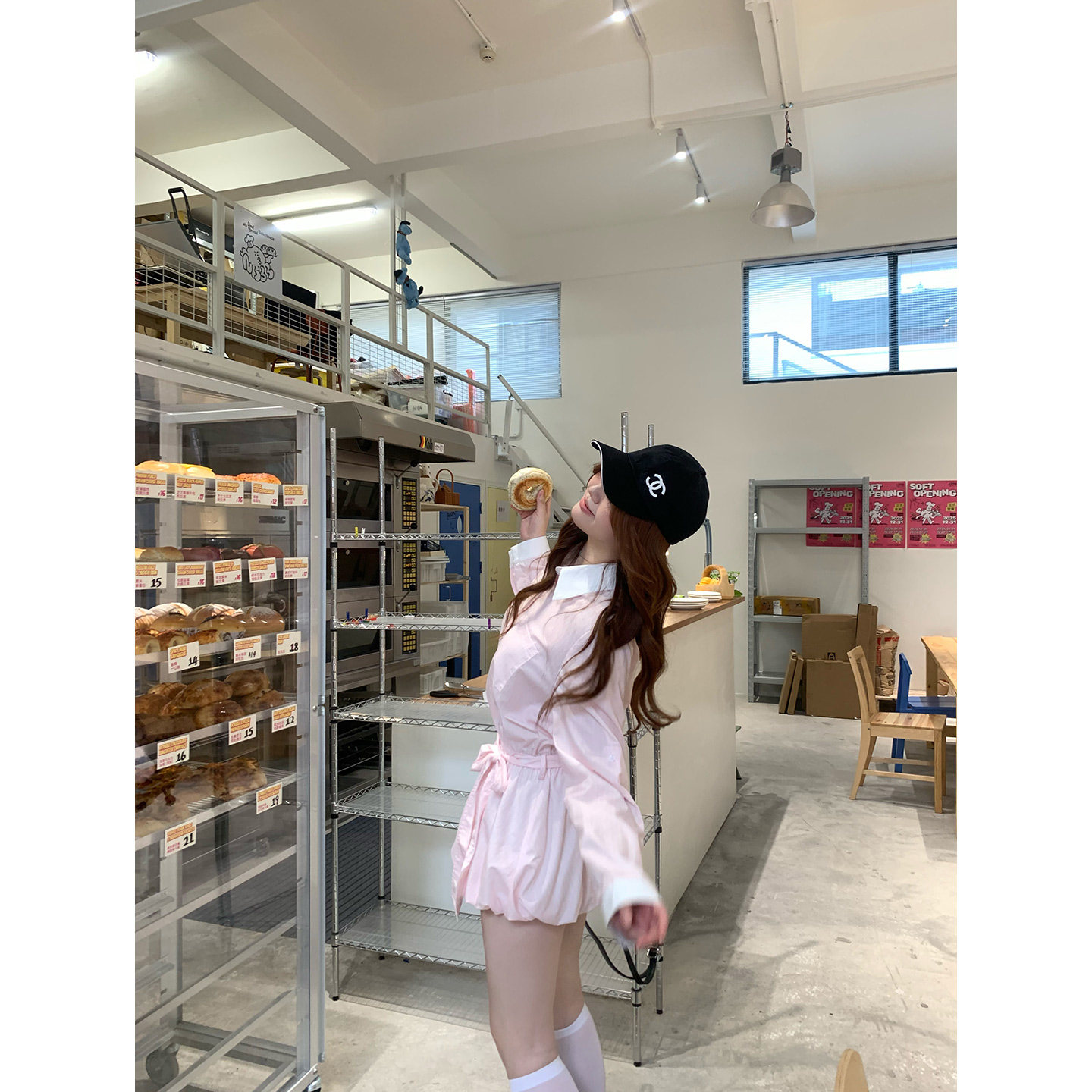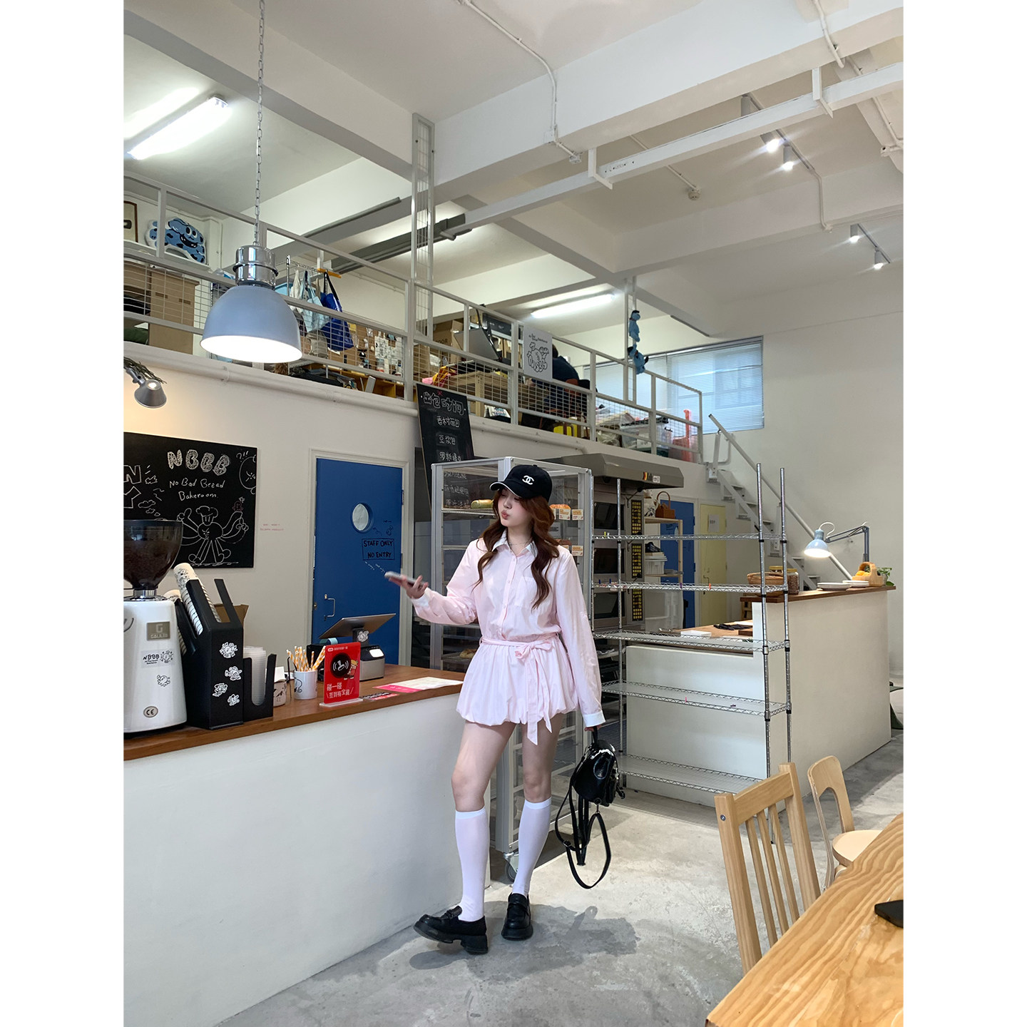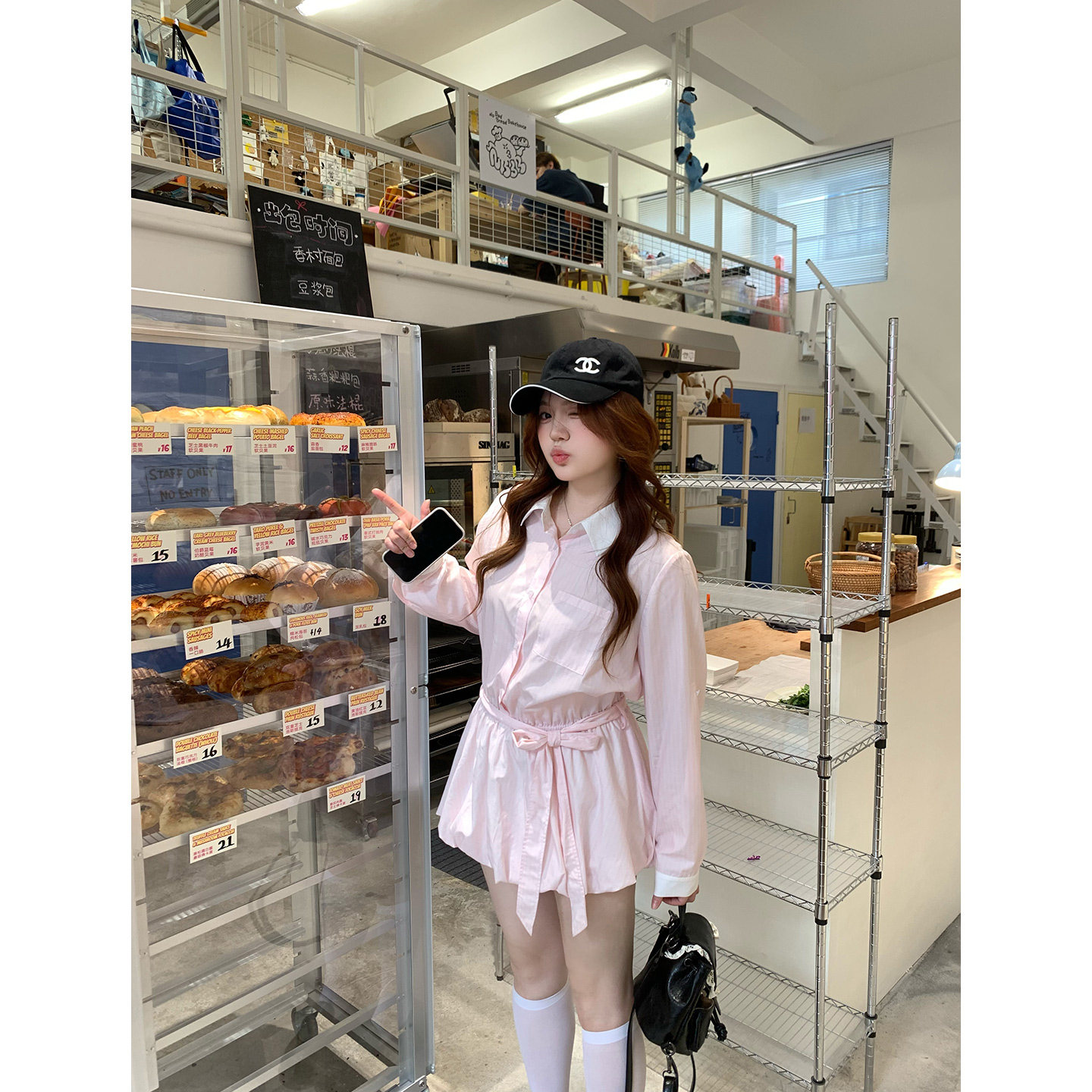 韩系微胖mm春夏条纹收腰绑带花苞衬衫 你 鱼 莓莓慕礼 连衣裙 长袖由