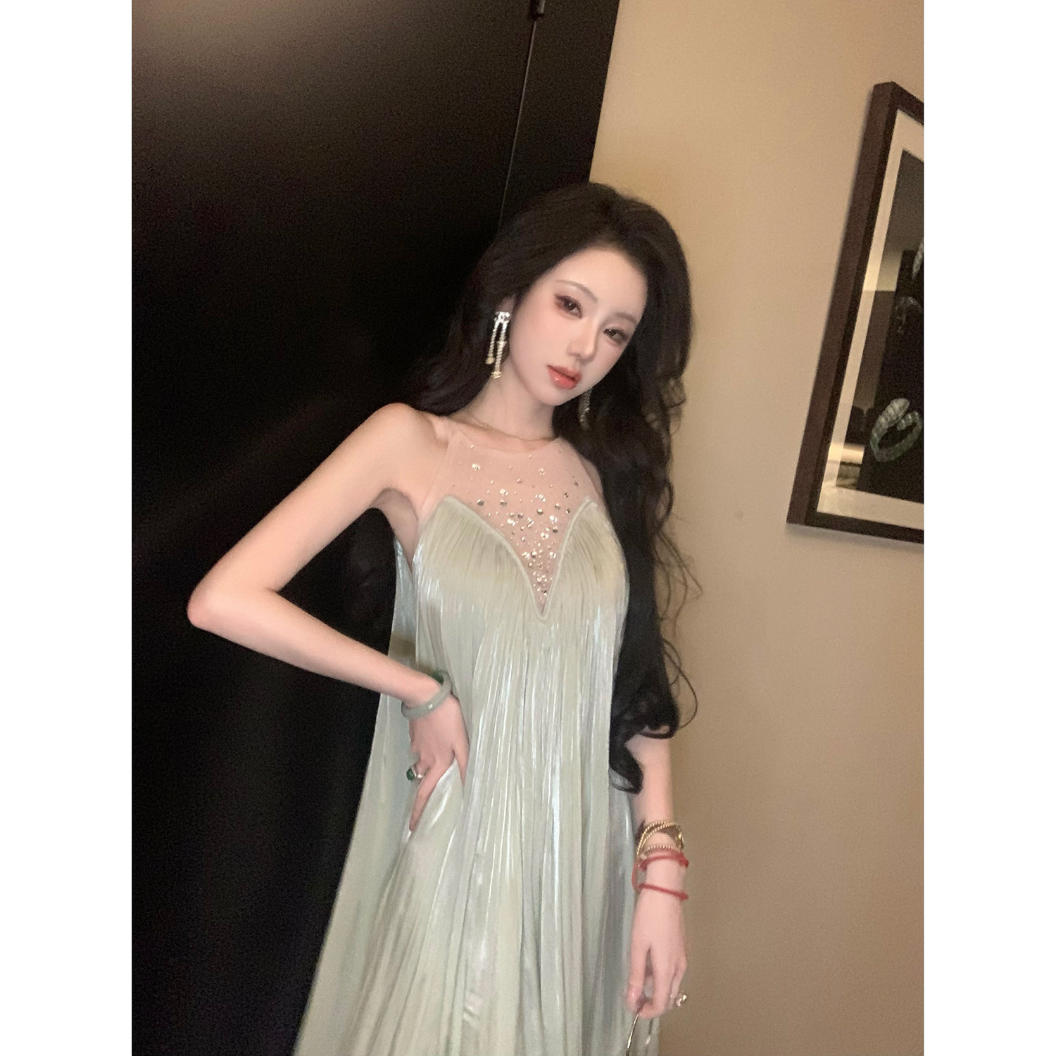 夏装 气质水光皱A字裙烫钻网纱拼接褶皱连衣长裙 情人泪 Sun雅乔