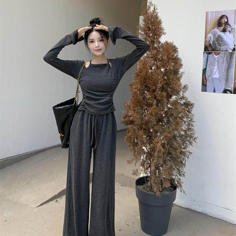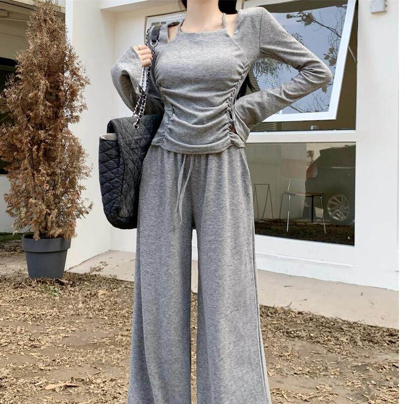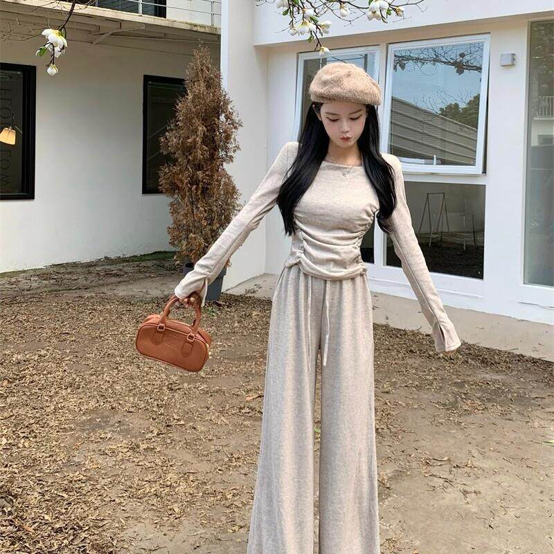 休闲套装 修身 高腰阔腿裤 心机辣妹时尚 T恤 法式 新款 女2025春季 长袖