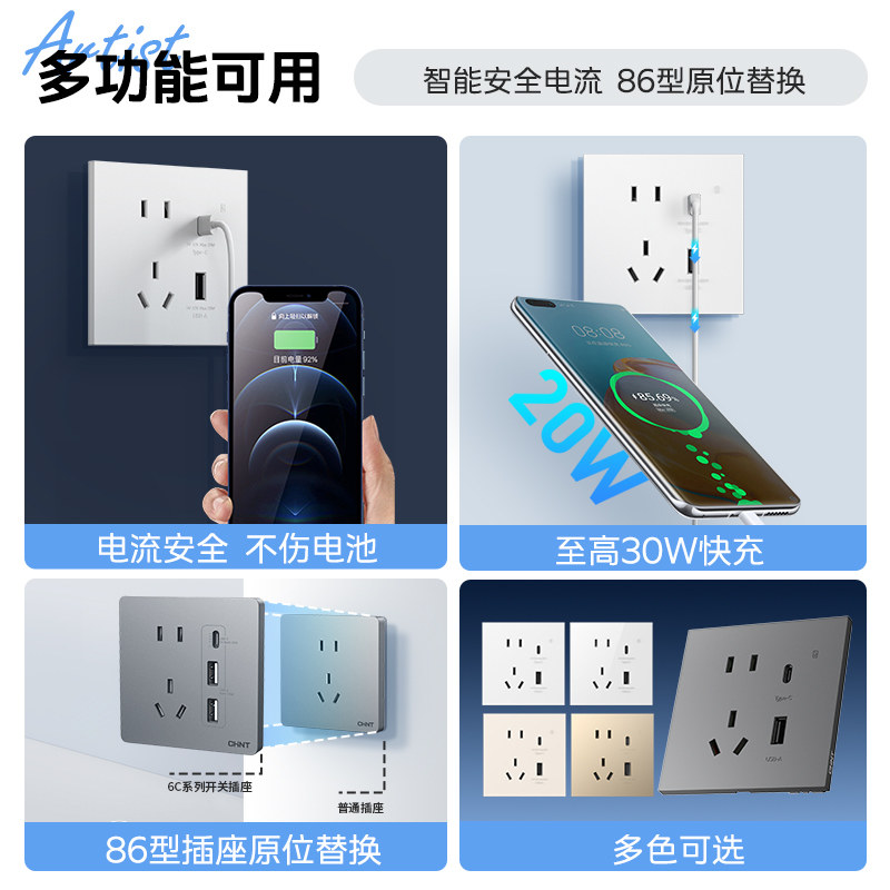 正泰开关插座86型typec快充多口usb五孔20W带接口充电30w插座面板