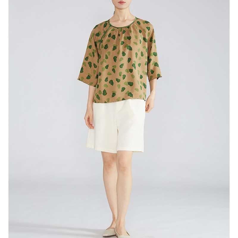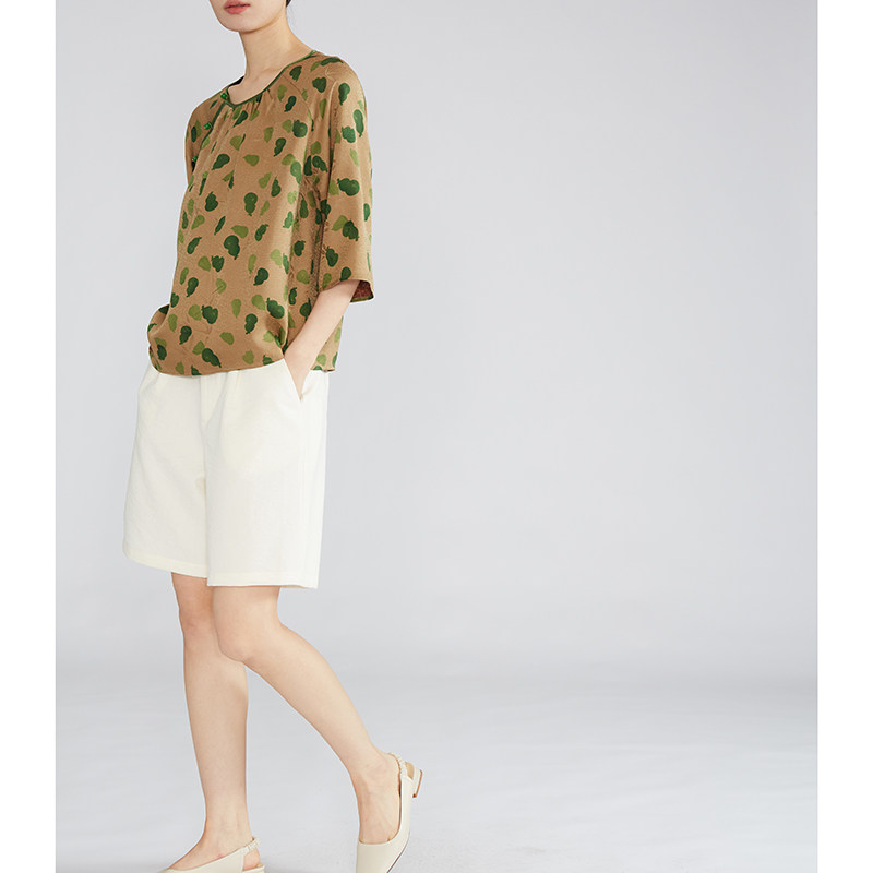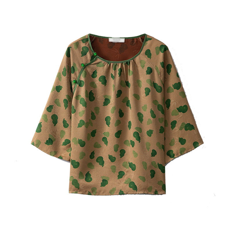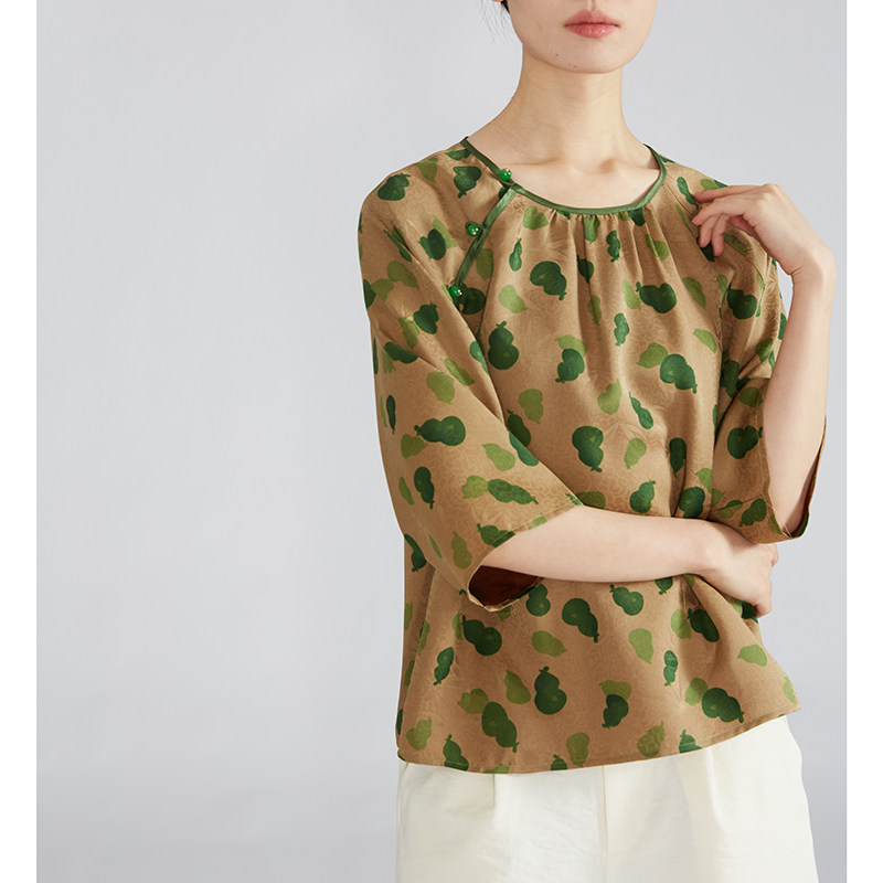 一丝牵 上衣女100%桑蚕丝圆领斜门襟宽松衬衣 真丝提花花萝五分袖由