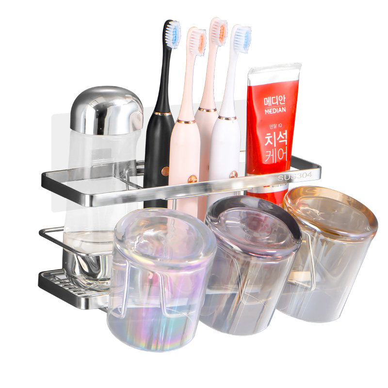 不锈钢电动牙刷架壁挂式 免打孔牙膏牙杯牙刷置物架漱口杯家庭套装