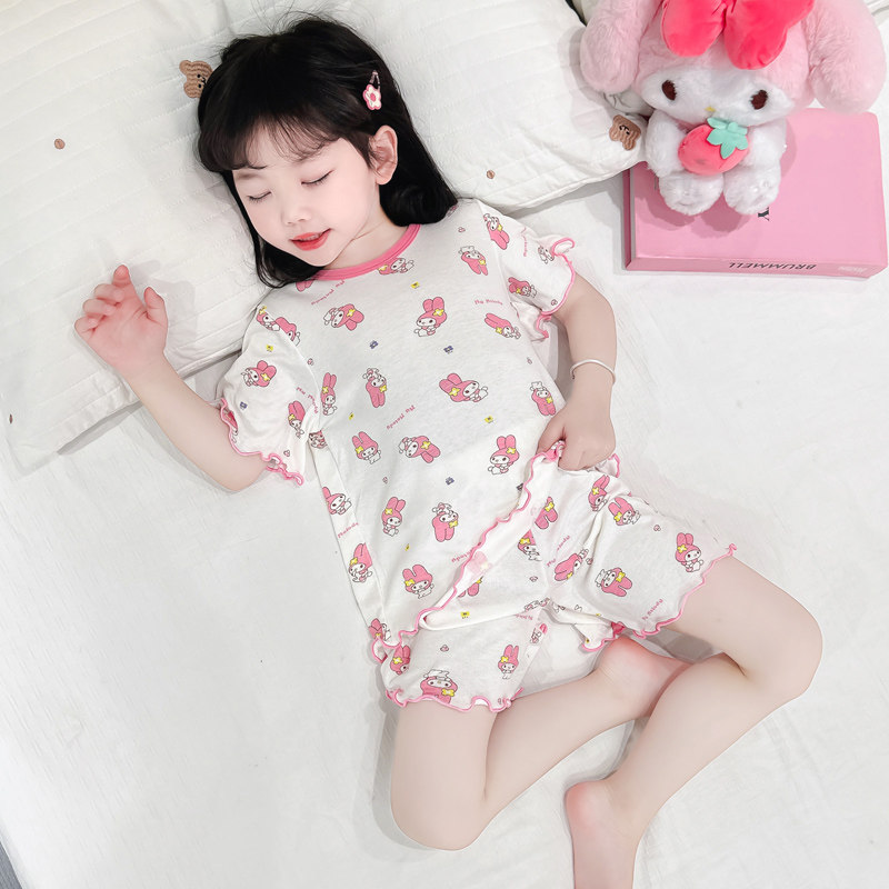 女童莫代尔短袖 睡衣女宝宝花边卡通印花家居服儿童夏季 套装 新 短裤由