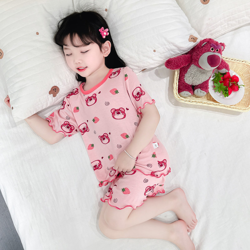 女童莫代尔短袖 睡衣女宝宝花边卡通印花家居服儿童夏季 套装 新 短裤